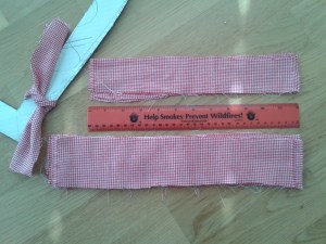 The fabric strips don’t have to be perfect–you can see above right, next to a ruler, how mine vary. Don’t get hung up on all that tedious measuring–just eyeball it! The important thing is that each strip is long enough to easily tie around your form.
