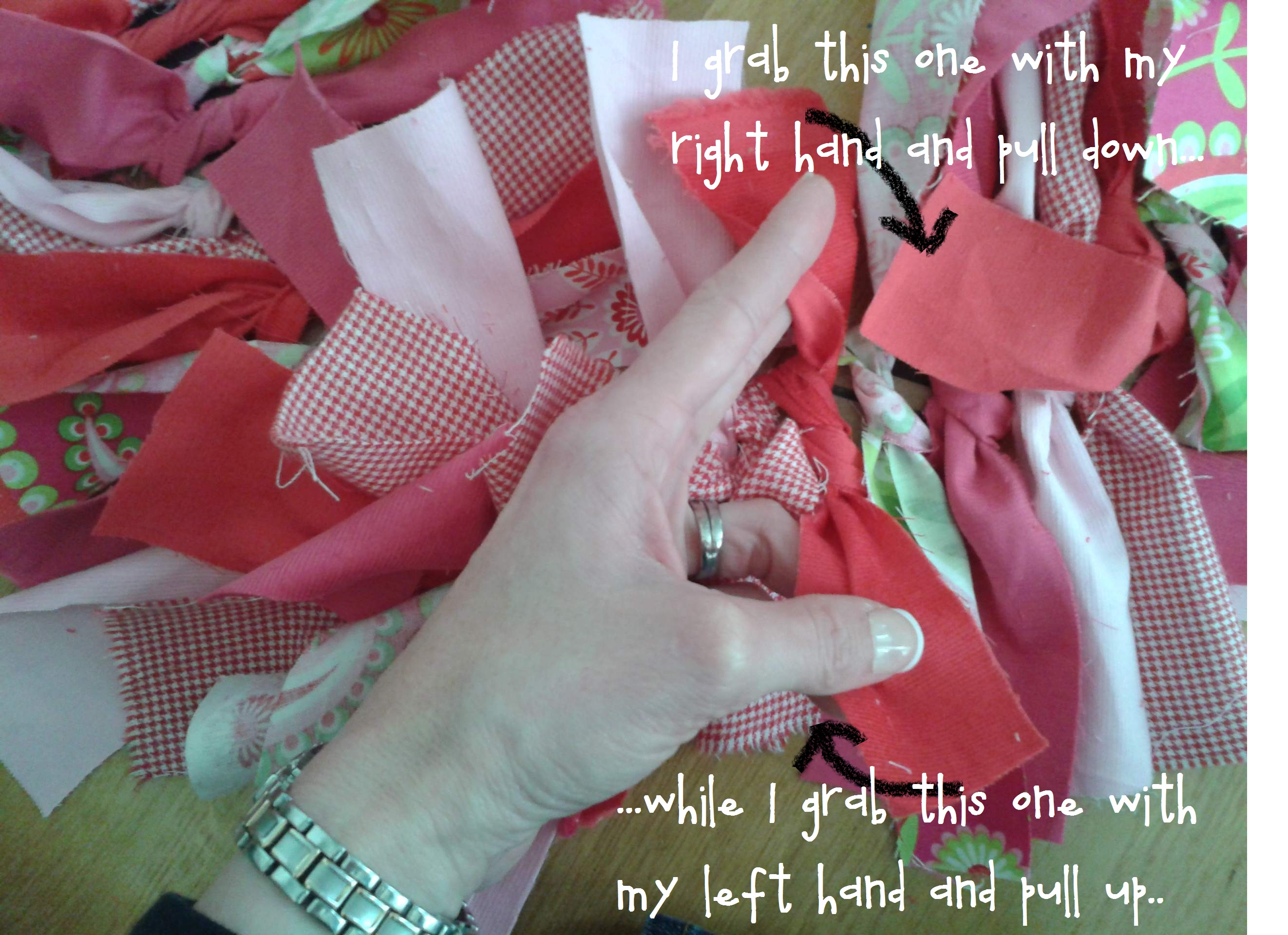 Then start foofing (that’s a technical term) by twisting each knot back against itself. [Looking at the below photo, I realized it might be a little confusing: I’m talking about grabbing the piece at the START of the arrow and pulling down or up, not grabbing the random piece I seem to be pointing to. Wups! So basically grab both ends of the red piece in my hand, and twist it back against itself.]