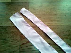 First rip a strip of fabric–I love the edge that ripping gives, but cutting is fine, too (below left). These strips are about 24″ long and 1.5-2.5″ wide (below right). You can use pretty much any length and width to achieve different flower sizes and thicknesses.