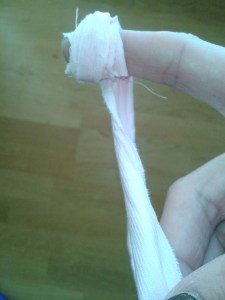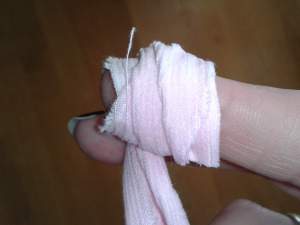 fold the strip of fabric in half and start wrapping it around your finger (below left). The fabric will natural twist as you hold it with one hand while wrapping it around a finger on the other (below right), but no worries! You want this to happen: just keep wrapping and twisting!
