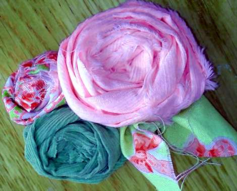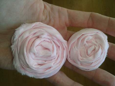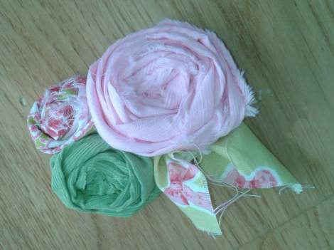 There are a gazillion tutorials on how to make a fabric flower out there–it is basically just wrapping and folding fabric around and around until you call it a flower–but here’s my fast & easy take on it:
