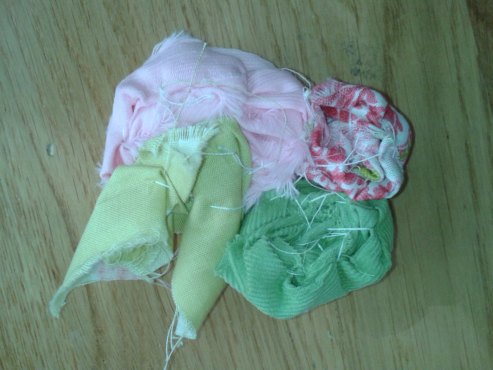 Next, secure your flowers (or else they’ll fall apart as easily as they wound together!) by pulling a needle and thread right through the middle, left to right, a few times then knotting off the thread. Then I like to sew three flowers of varying sizes and pattern together to make a little “bouquet” (I’m also adding a couple of loose folds of green fabric here for “leaves,” below).