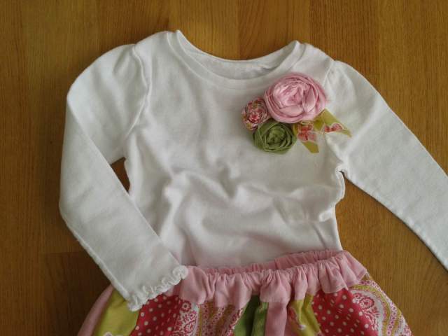 …Or add it to a simple white shirt to complete an outfit (below)! I love the soft long-sleeved garanimals ones you can pick up for about $3-4 each at WallyWorld–cheap as chips and they have the cutest lettuce-edge sleeves and hem.