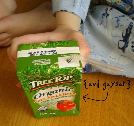 Ah, juice boxes. The bane of many a preschool mama’s existence. You love ’em–they’re convenient, pre-measured, and fast… You hate ’em–what, do the makers get some sick, twisted pleasure out of spring-loading those little boxes to squirt sticky apple juice old-faithful-style the moment my preschooler grabs hold?