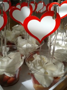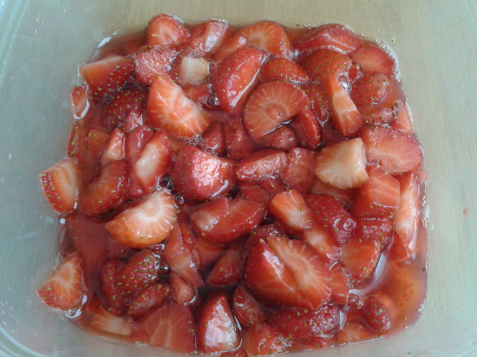 First, wash & set aside one nice strawberry for every two dessert servings you’re making (these will be the heart garnishes later). Then get the rest of your strawberries all sweet & soft by washing them, cutting them up, and putting them in a bowl; add sugar and water to make a simple syrup. I used a half-cup of sugar & a 1/4-cup of water for three pounds–or three containers–of strawberries. This is not an exact science, but a 2:1 sugar to water ratio works well. It doesn’t matter if the mixture is soupy because you can use as little of the syrup later as you choose. Set the bowl aside for at least half an hour, so it has time to get all lovely!