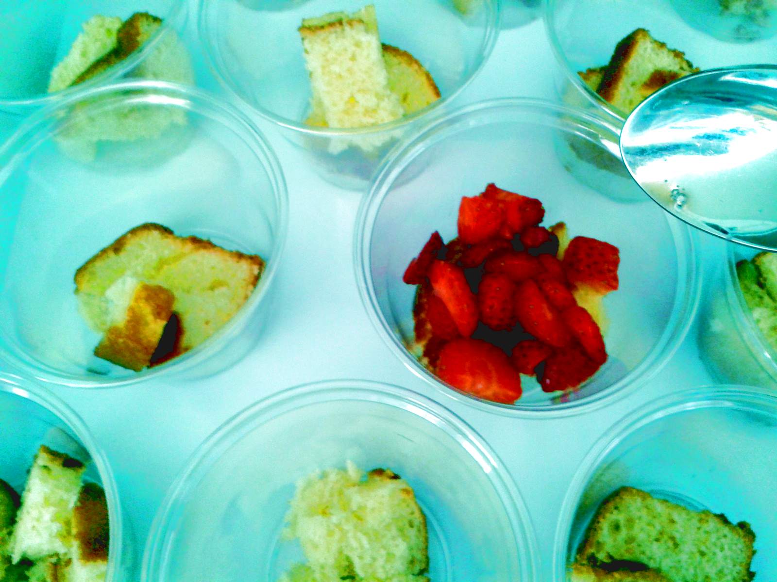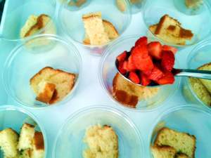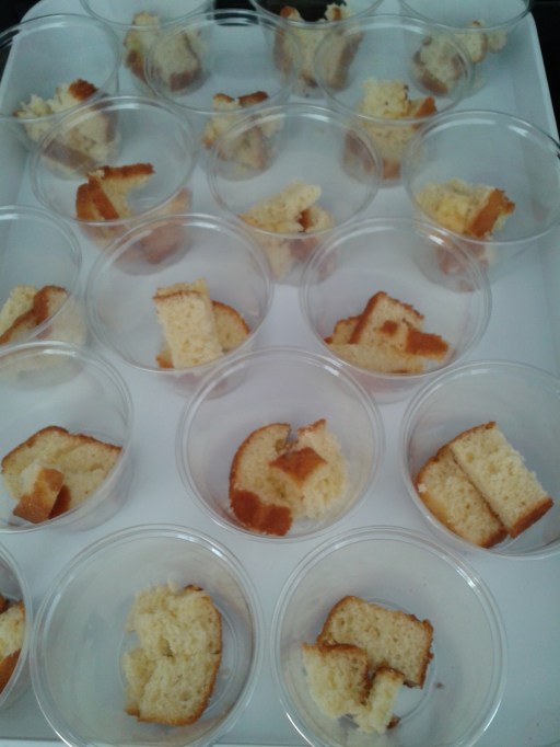 I love these little plastic solo cups; they are a great single-serve size. Slice the pound cake into about half-inch slices, then cut each slice into halves or thirds to fit easily in the cups.