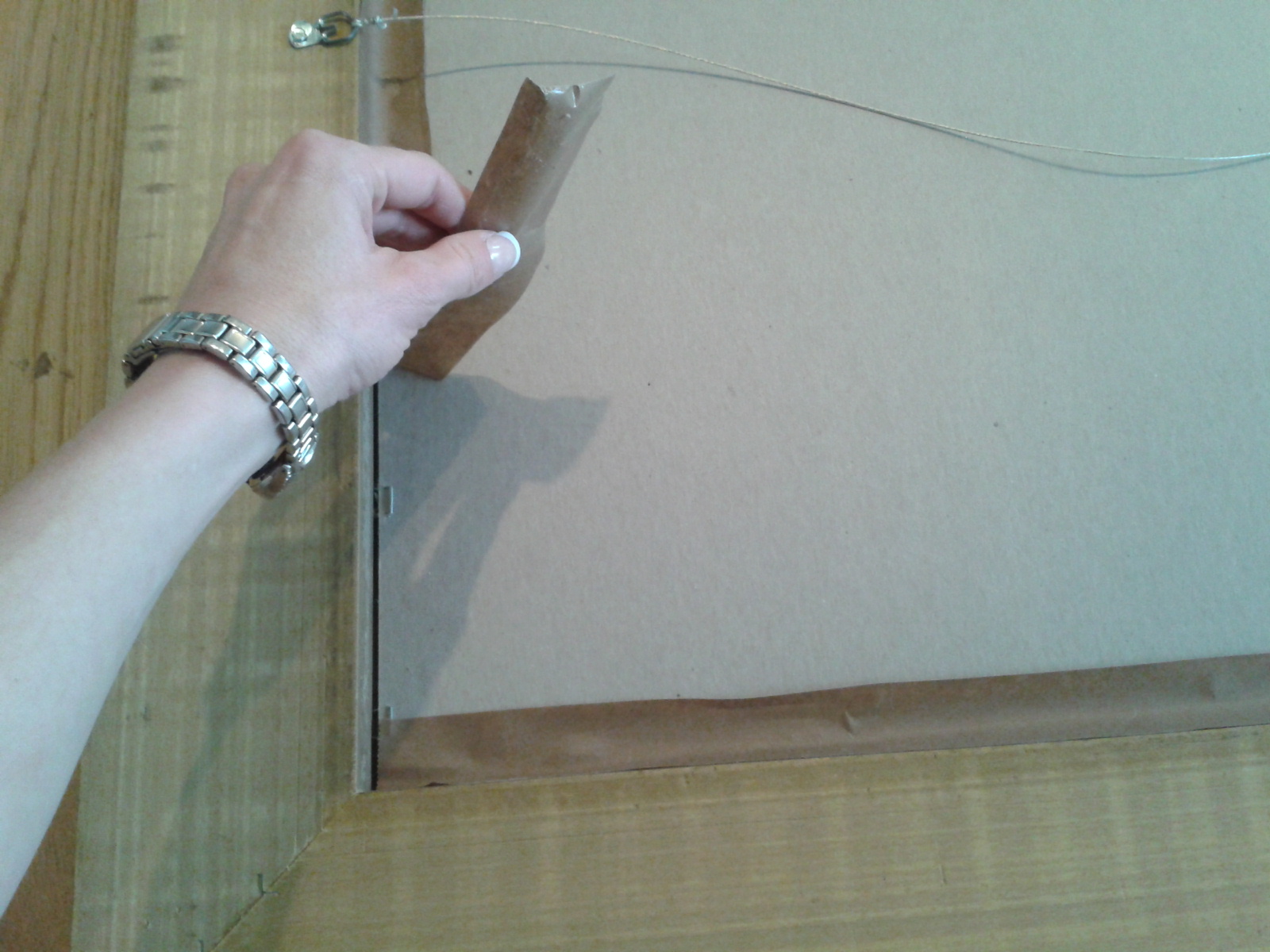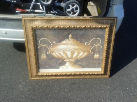 I flipped the whole thing over and removed the tape, staples, urn print, & glass. Ahhh, better already.