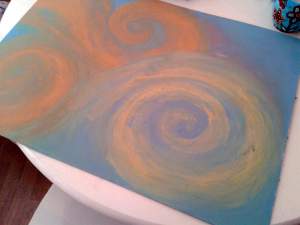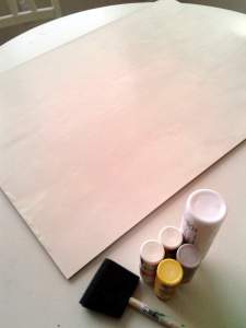 The urn print was actually mounted to a piece of thin fiberboard, so I decided to just paint straight onto that and save having to measure & buy or build a canvas! Score. First I covered my “canvas” with a base coat of creamy white… Then I started painting in one direction, changed my mind, and ended up with this (below right).