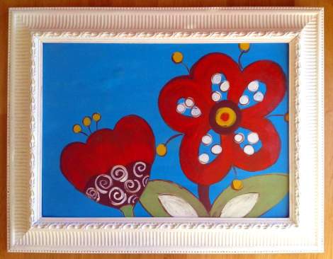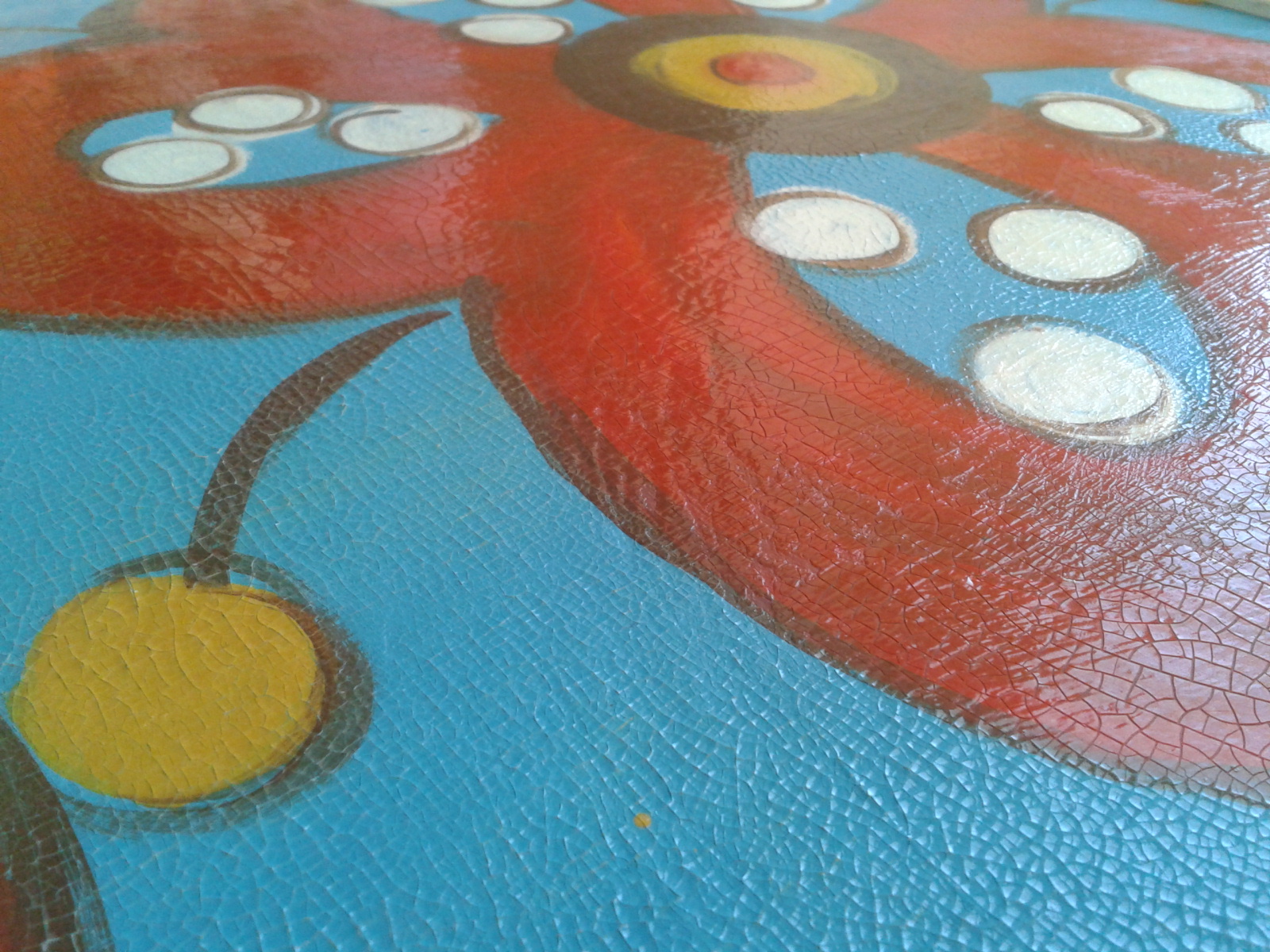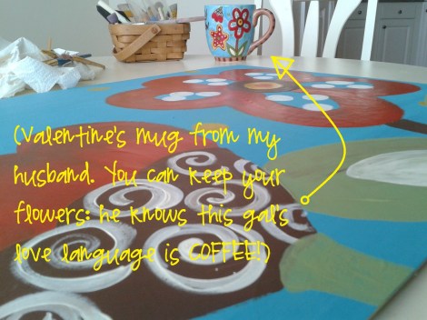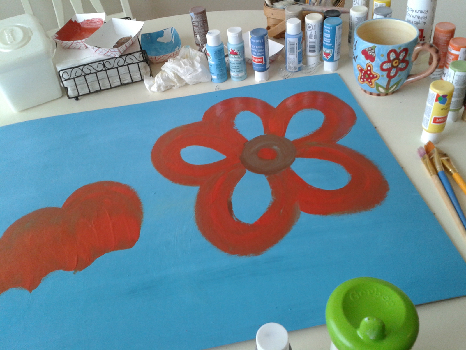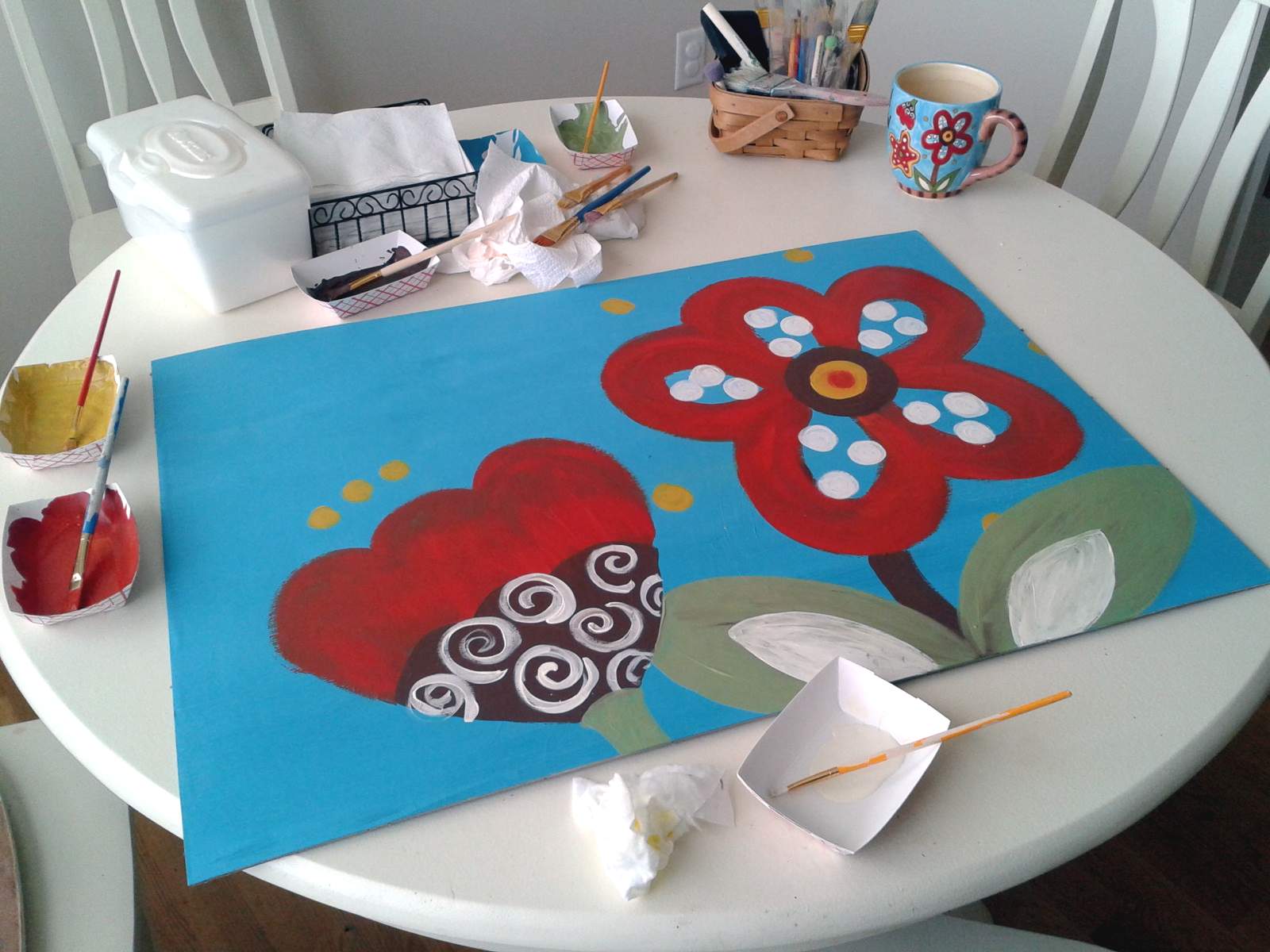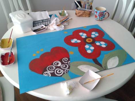 Meh. I didn’t love it. But no worries, it’s just paint! Get tangled up, just tango on! Or–you know–just PAINT on! First I recovered the background in something BRIGHT… then doodled a few funky flowers…