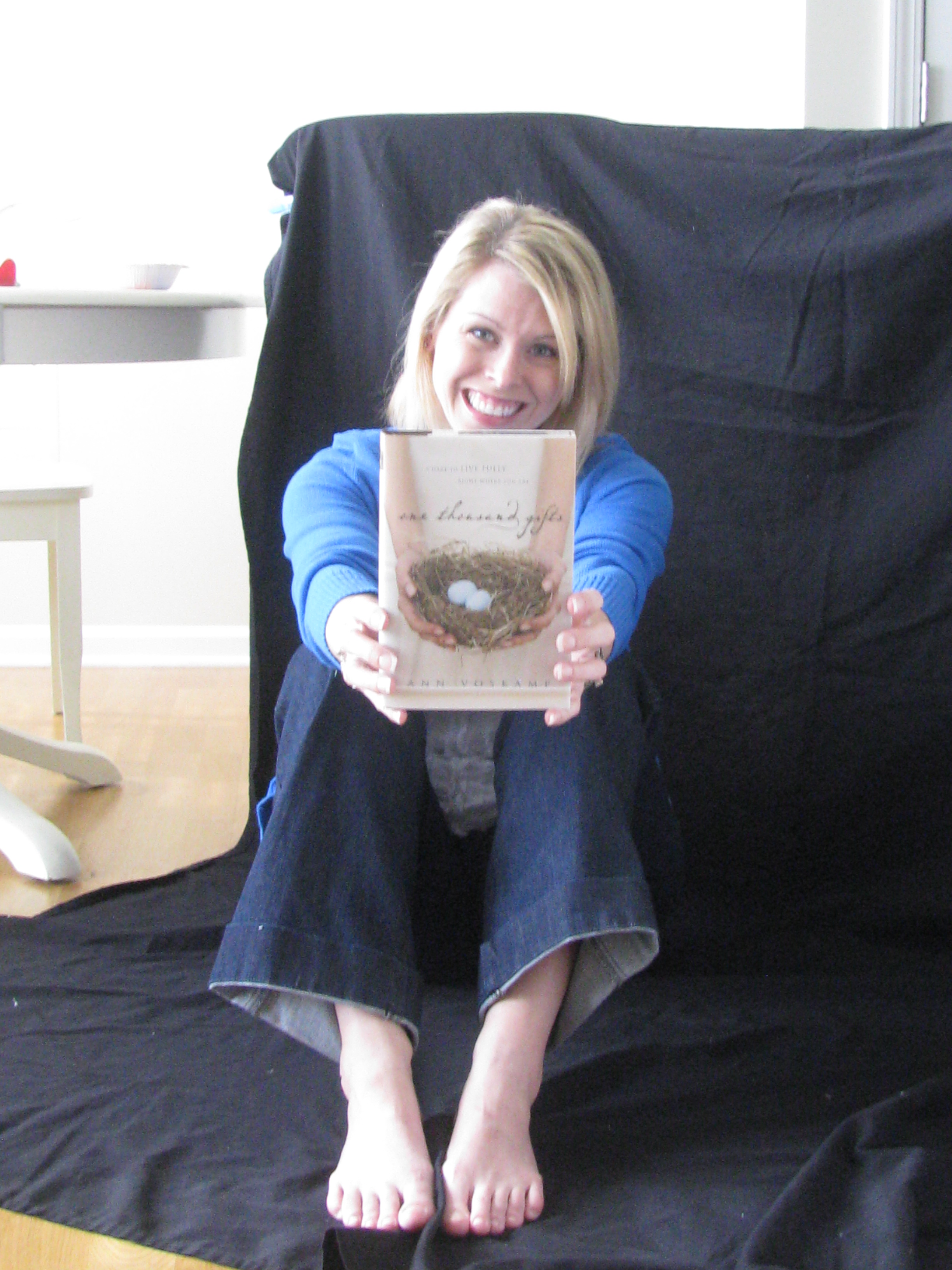 Just make sure to angle yourself (or, um, your then-7-yr-old photographer) so that the backdrop is the, um, backdrop. {Incidentally, this is the New York Times bestselling One Thousand Gifts by Ann Voskamp, and if you haven’t read it yet, please run out and get it immediately. It is change-your-life amazing. She blogs at aholyexperience.com}