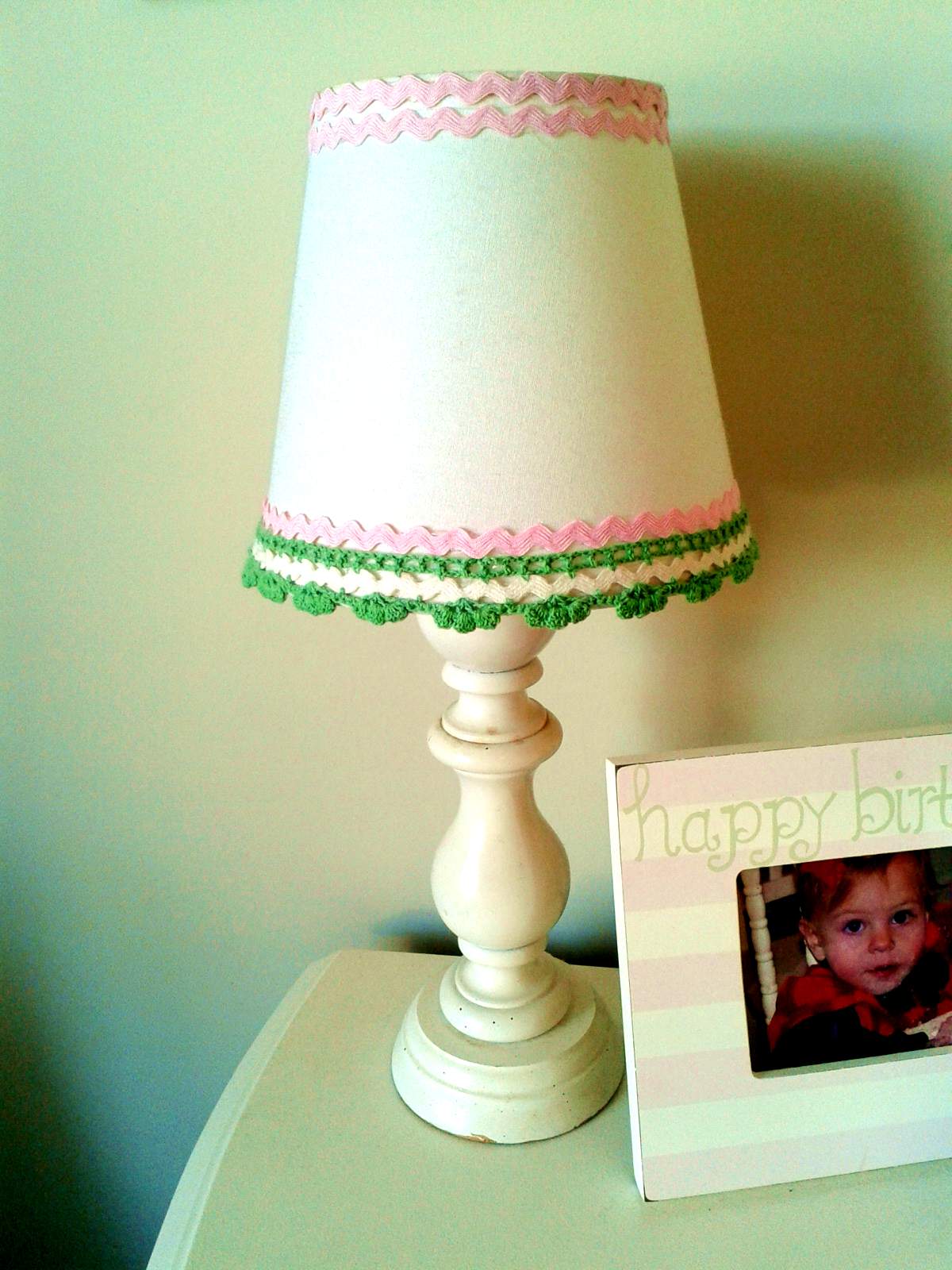 The lamp came from Goodwill for a whopping $3. Both the base and cord looked in good condition, so I went for it. [Incidentally, did you know that Goodwill has a return policy on electronics? So it’s no risk: if the item does not work, return it. Check with your local thrift store to see if the same holds true for you.] We already had the shade from an old, unused lamp, and I dressed it up a bit with some crochet trim & ric-rac I had.