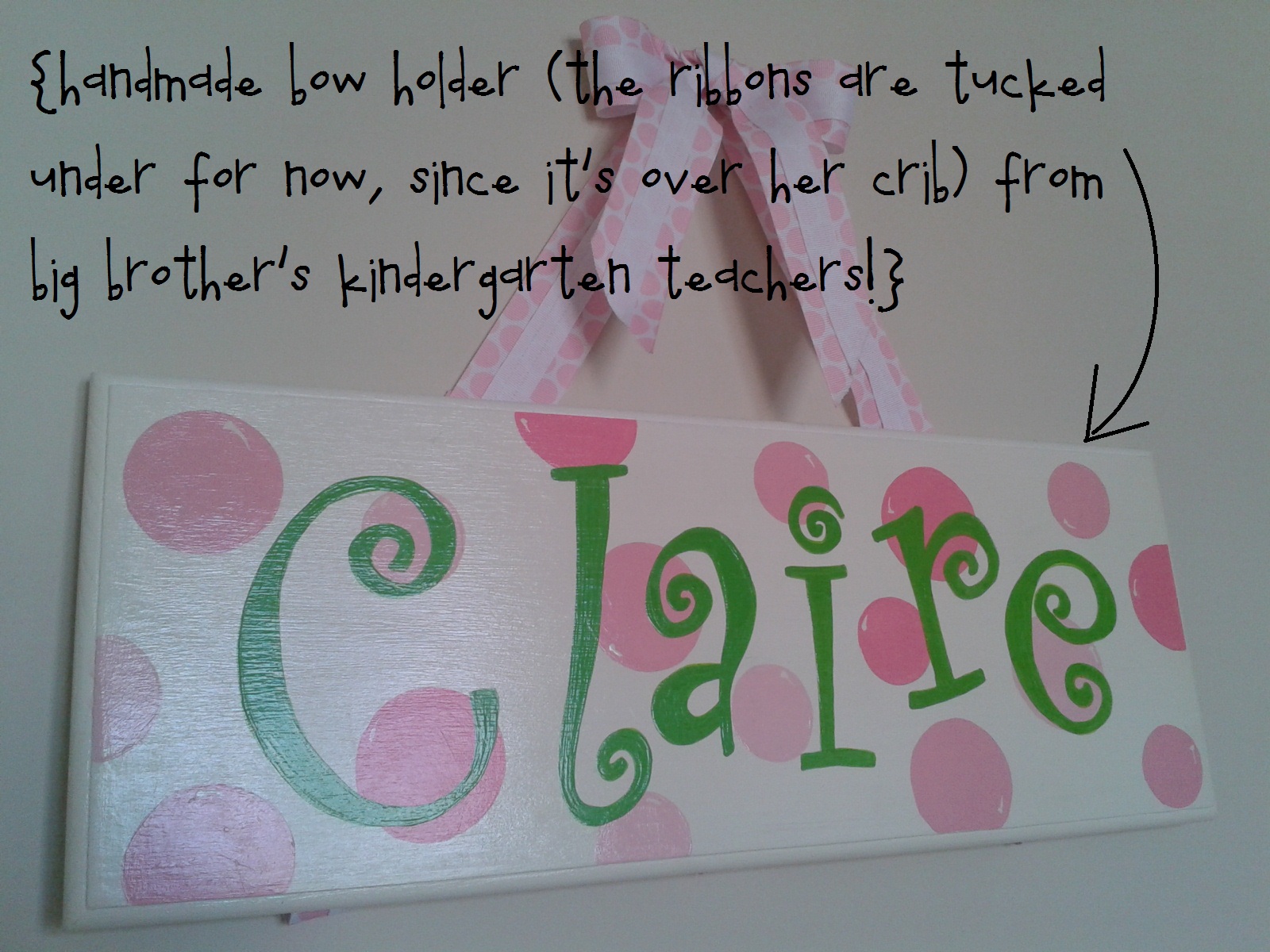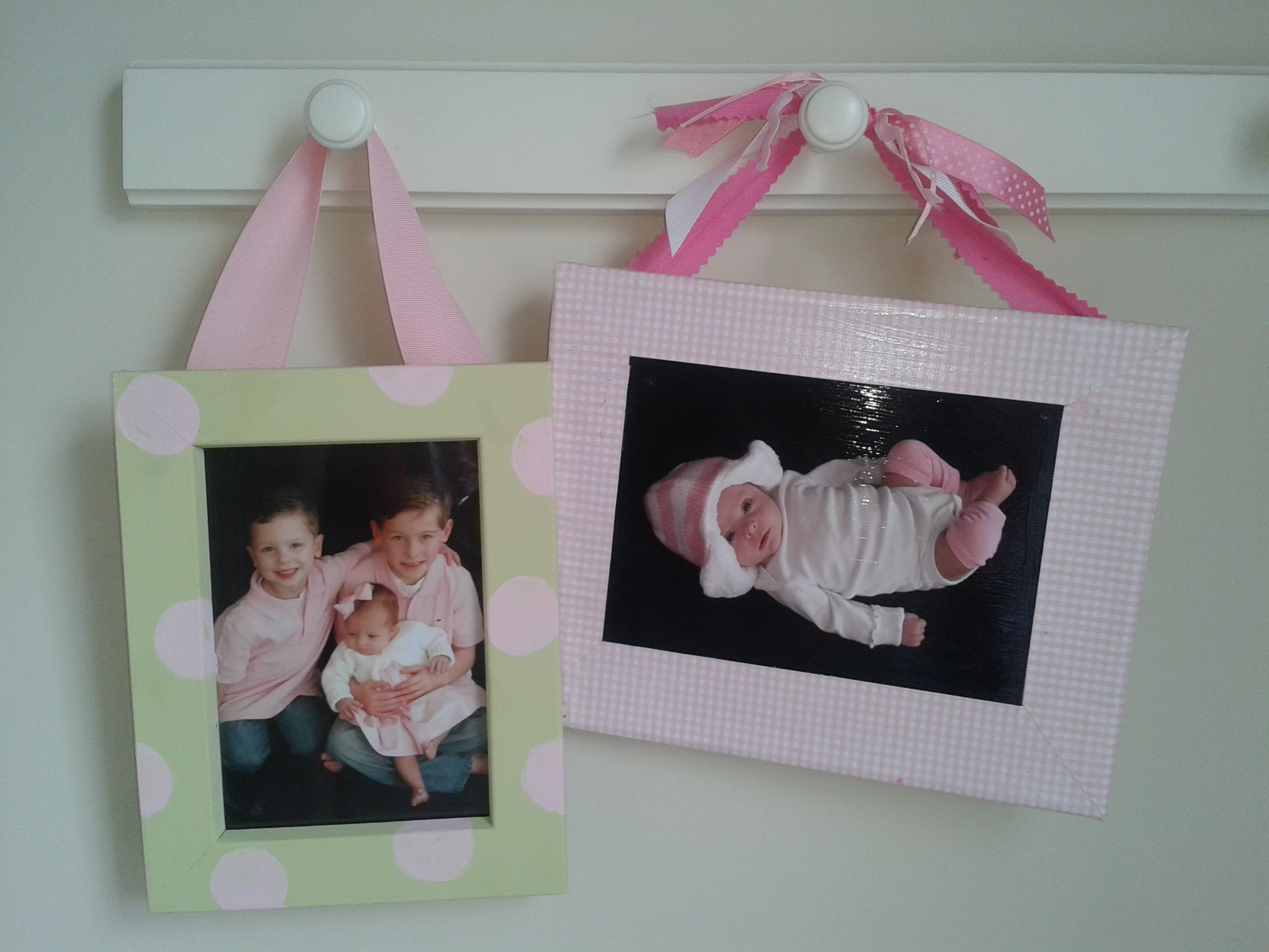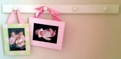 This peg rack is great for me because I just love to change things up & it allows me to do so without any nail hole commitment. The price was even better: marked down to about $10. The two pictures hanging on there now are an old frame that I painted and polka-dotted with craft paint and an old canvas over which I modpodged some pink gingham scrapbook paper. Then I staple-gunned some ribbon on the backs to make hangers. The two photos were shot in our “home studio” (which I blogged about yesterday here if you want to see how to snap some free “professional” pics of your kids, too). The left one was simply inserted into the frame and the second was modpodged straight onto the scrapbook-papered canvas.