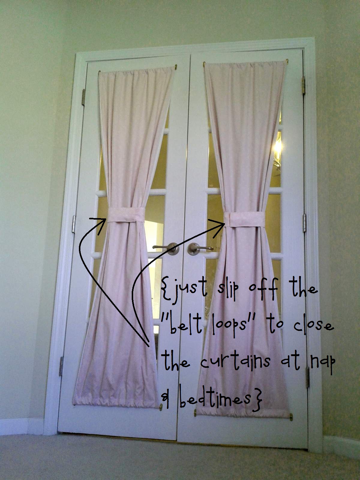 Our daughter’s bedroom is not actually a bedroom at all, but technically a bonus room. We used to use it as an office & play room, but when it became hers, the glass-paned double doors leading into it needed to be dressed. My sweet, generous sister-in-law had gifted us curtain panels from PB Outlet for the window, so I bought a third matching one ($25) and cut it in half and “black-out” lined it with some heavy, opaque upholstery fabric I got in the bargain bin at the fabric store for about $4. The tie-backs are two halves of what used to be the top of the curtain panel, so each tie back literally has a hidden beltloop (curtain rod loop) through which to thread one end and form the tie-back. I hung them using very inexpensive rods at the top and bottom. Here’s the view from outside (left) and inside (right).