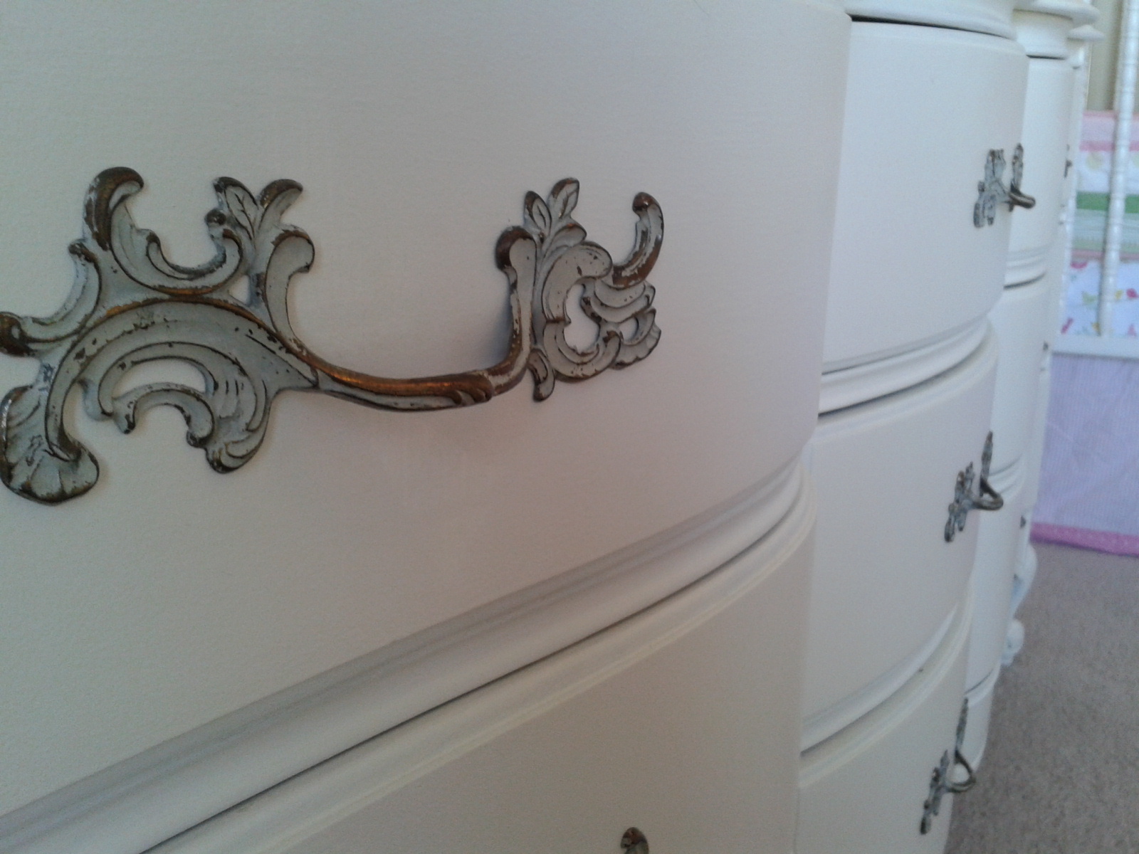 Now since this bedroom is not ACTUALLY a bedroom, storage could be a real issue. Thankfully, we have an old TV armoire that–thanks to a tension rod–became a closet. I just girlied it up with a set of mercury glass knobs I got at HomeGoods for $7. And I searched thrift stores and CraigsList to finally hit the jackpot with this storage mecca of a dresser. It is the EXACT style I was hoping for, all girly and feminine, and although I was originally looking for an uber-cheap deal I could paint myself, I traded the cost of paint and we coughed up $125 for this little pretty. WAY more than we’d ever usually pay, but well worth it to get exactly what I wanted already painted the color I was going to paint it!
