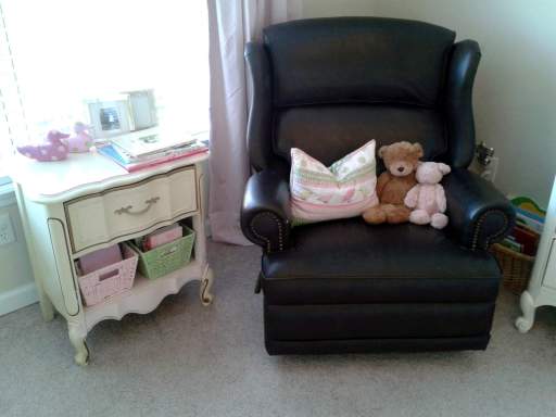 The chair. It’s comfy & wonderful & faithful, a gift friends gave us MANY years ago. We love it. It even rocks or reclines! But the dark brown leather worked much better for a boy’s blue & brown baseball themed room than for a girl’s pink and green girlie-girl room… Methinks a slipcover is in its future. I mean, how hard could it be to sew a custom slipcover, right? Get tangled up, just tango on; that’s my motto.