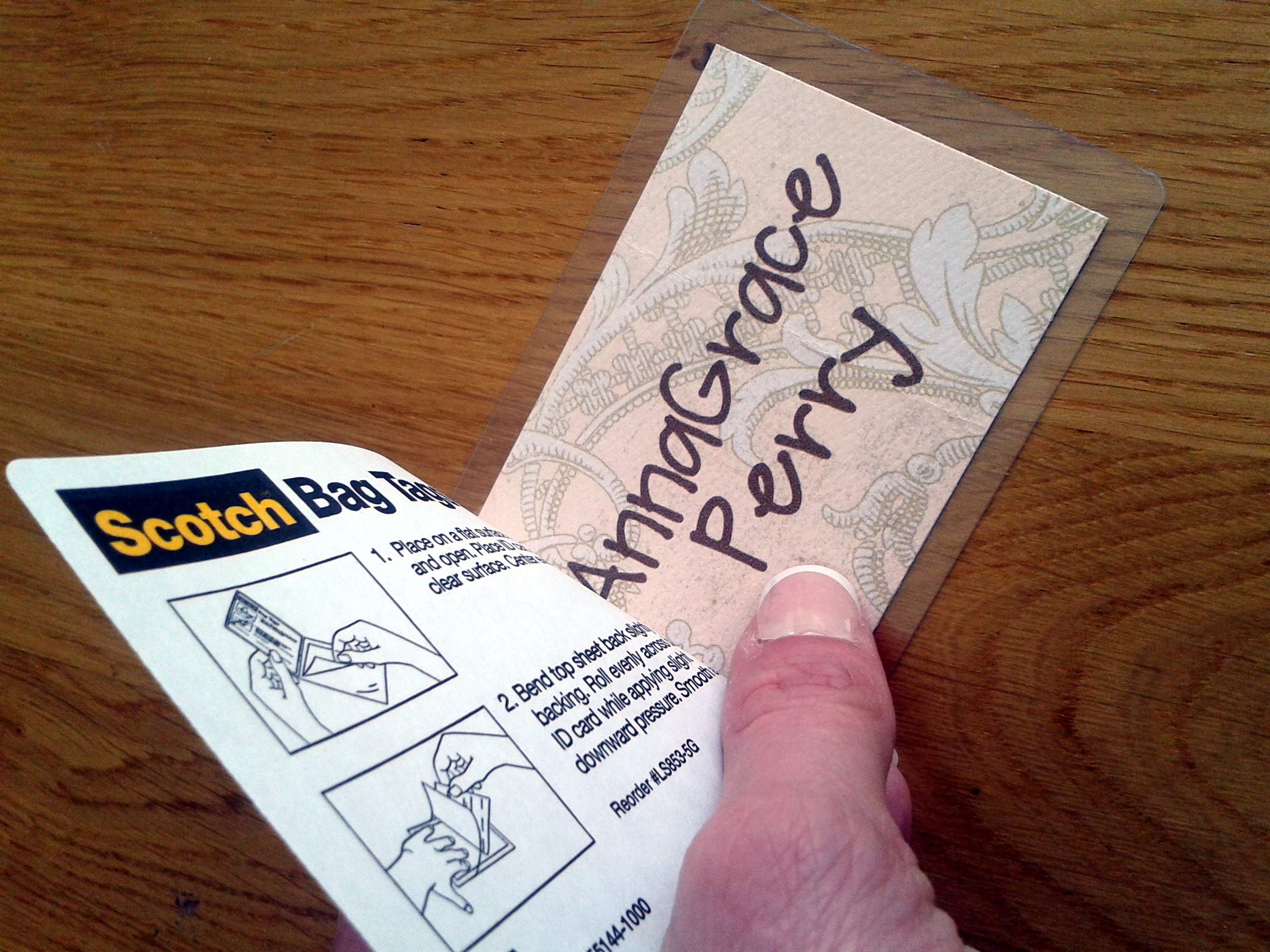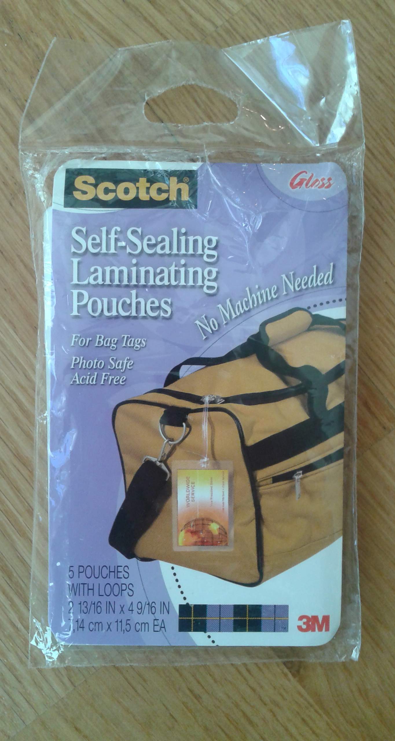You will need a sheet of scrapbook paper (8.5″ x 11″ or 12″ x 12″ trimmed to fit in your printer), computer & printer, and these (below) self-sealing laminating pouches for bag tags (available at office supply stores). {I actually have an electric heat laminator, but I often prefer to use these because they are thicker and quicker.}