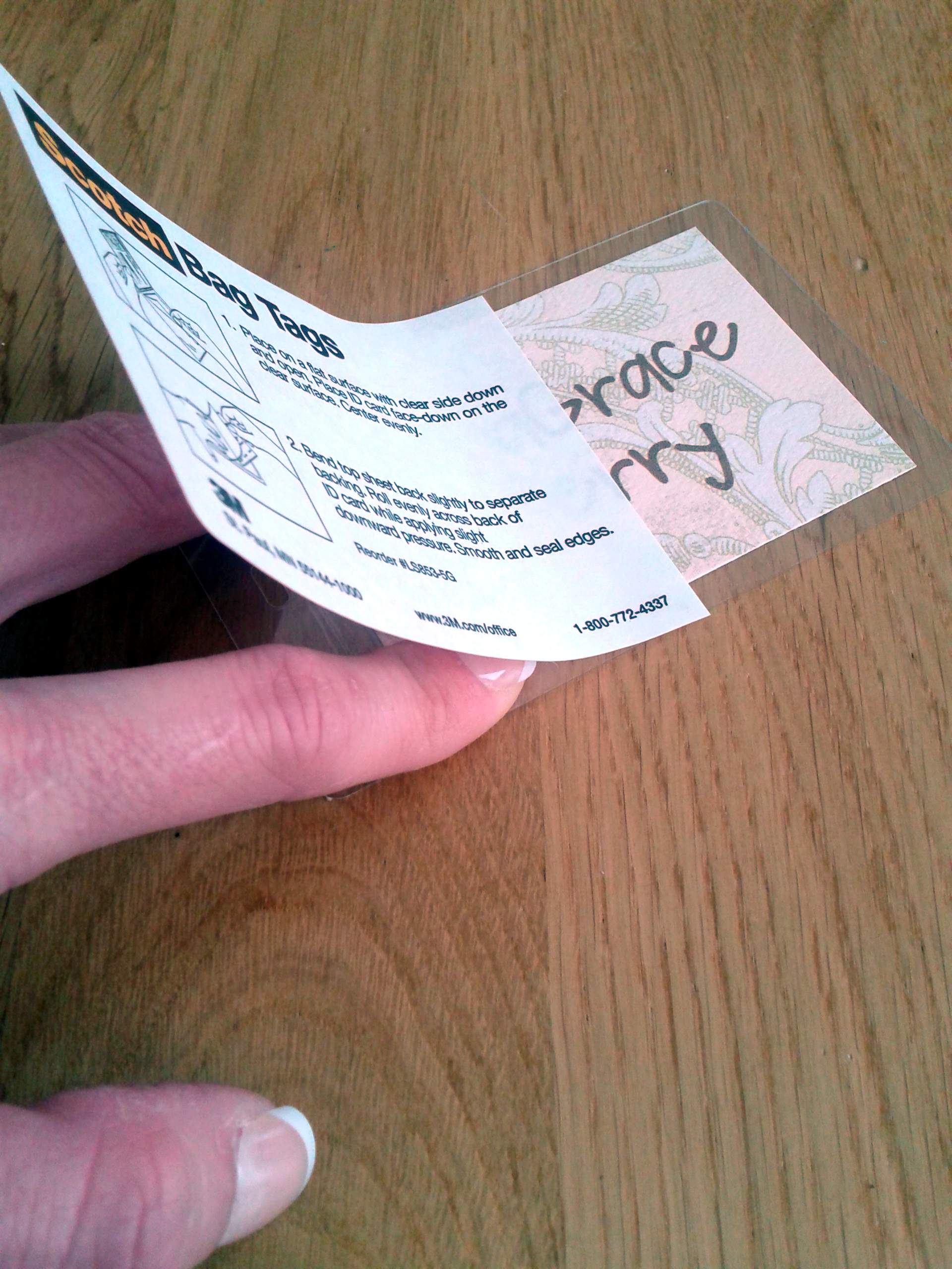 Next, carefully position your printed tag and peel back the sticky paper on the laminating pouch, smoothing it down as you go (it’s important to do it as you go to avoid air bubbles).