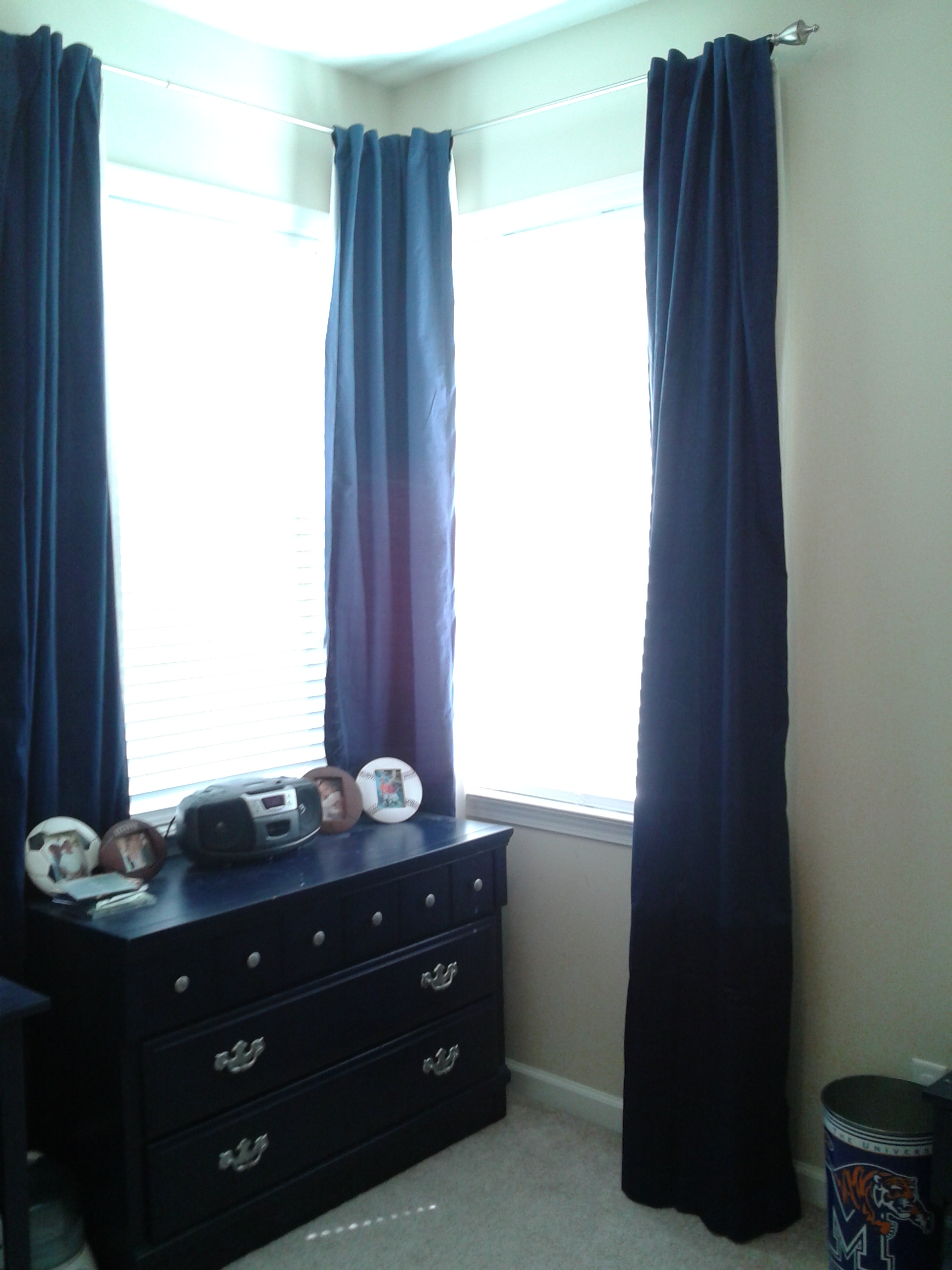 I had a random single navy & single white panel from Pottery Barn Outlet, and I bought a two pack of navy and a two-pack of white panels from WallyWorld. So there are actually six, not three, panels pictured here in the “before” pictures because I “lined” each navy panel with a white one to make them a little fancier and for more light control. When I hung these curtains in my now-eight-year-old’s room, I hung them high with the intention of lengthening them…