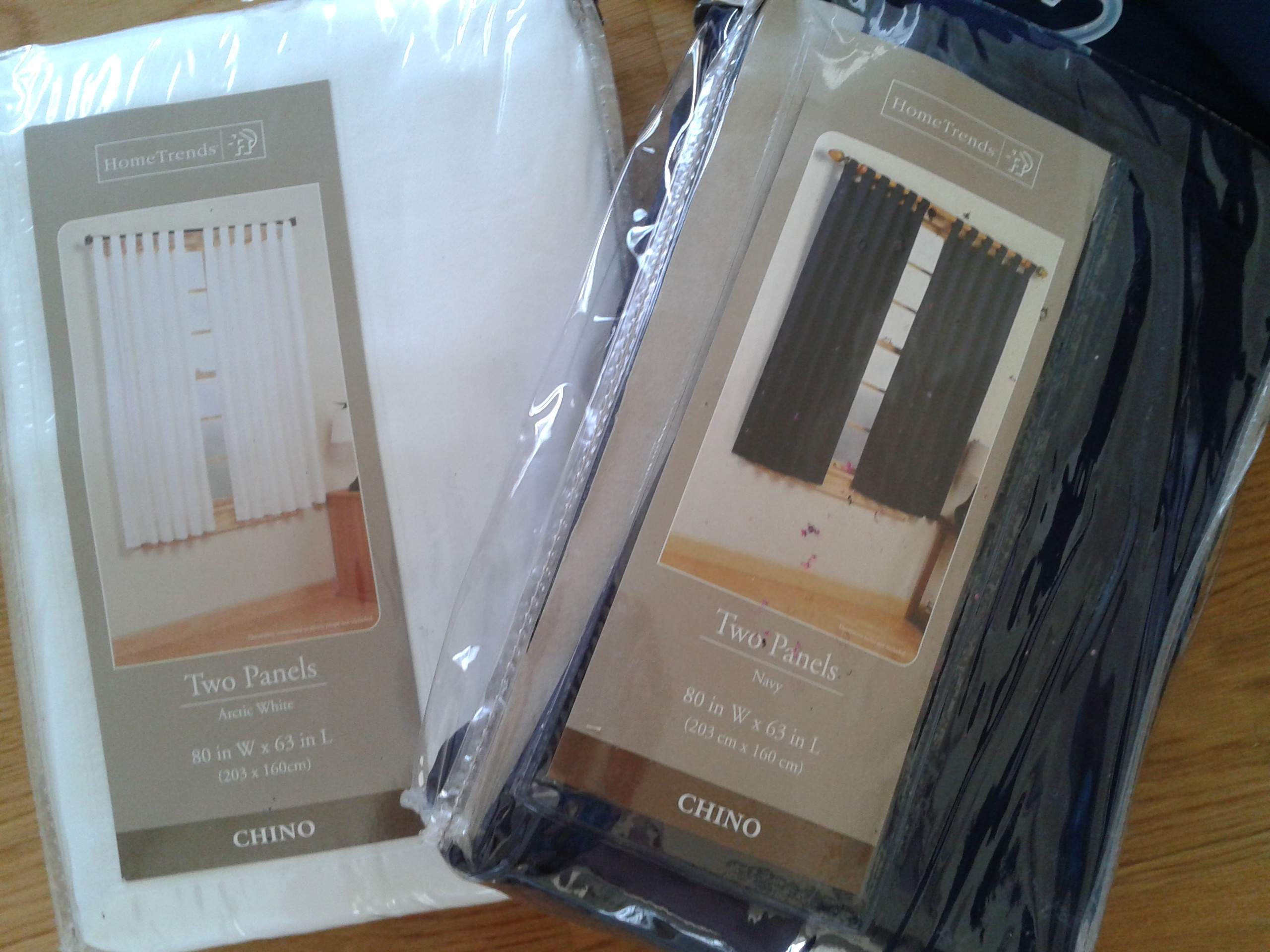 But today I got all gung-ho and lengthened them. The original panels were all 84″, too short to span the height needed. So I bought another two-pack of navy and two-pack of white short length (63″) to add to the bottom of the existing panels. I cut the short panels in half from left to right & cut off the tab tops. As the old and new were the vsame width, all I had to do was sew a straight line across to attach the existing panels to the extension pieces, right sides together.