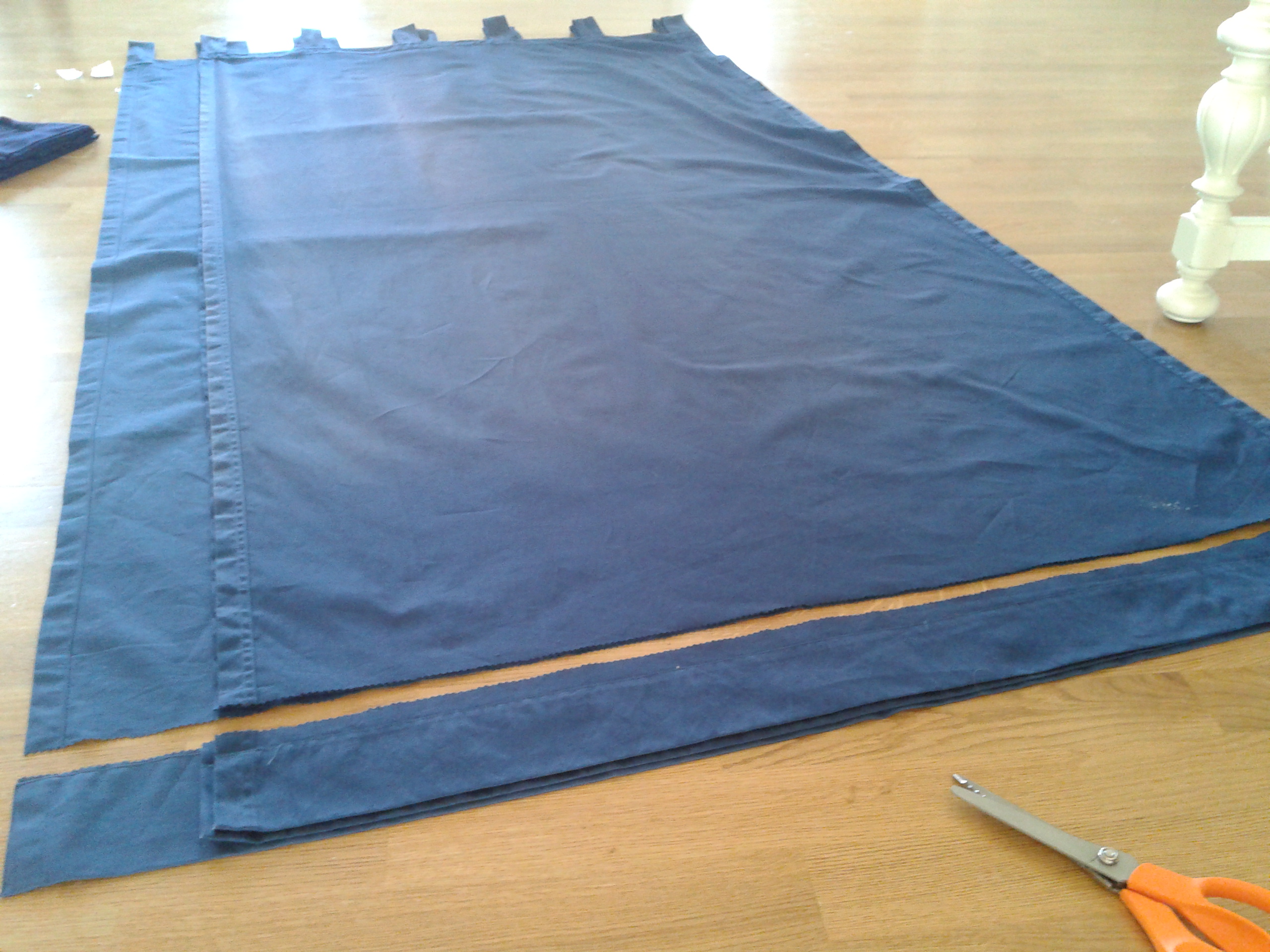 Then I did a little cut-and-paste… Or, er, cut-and-sew… [Below: the “commitment cut.” YIKES!] One of the panels was wider, but I hemmed it up the side so it was the same width as the other two and so the added navy fabric was already the right width.