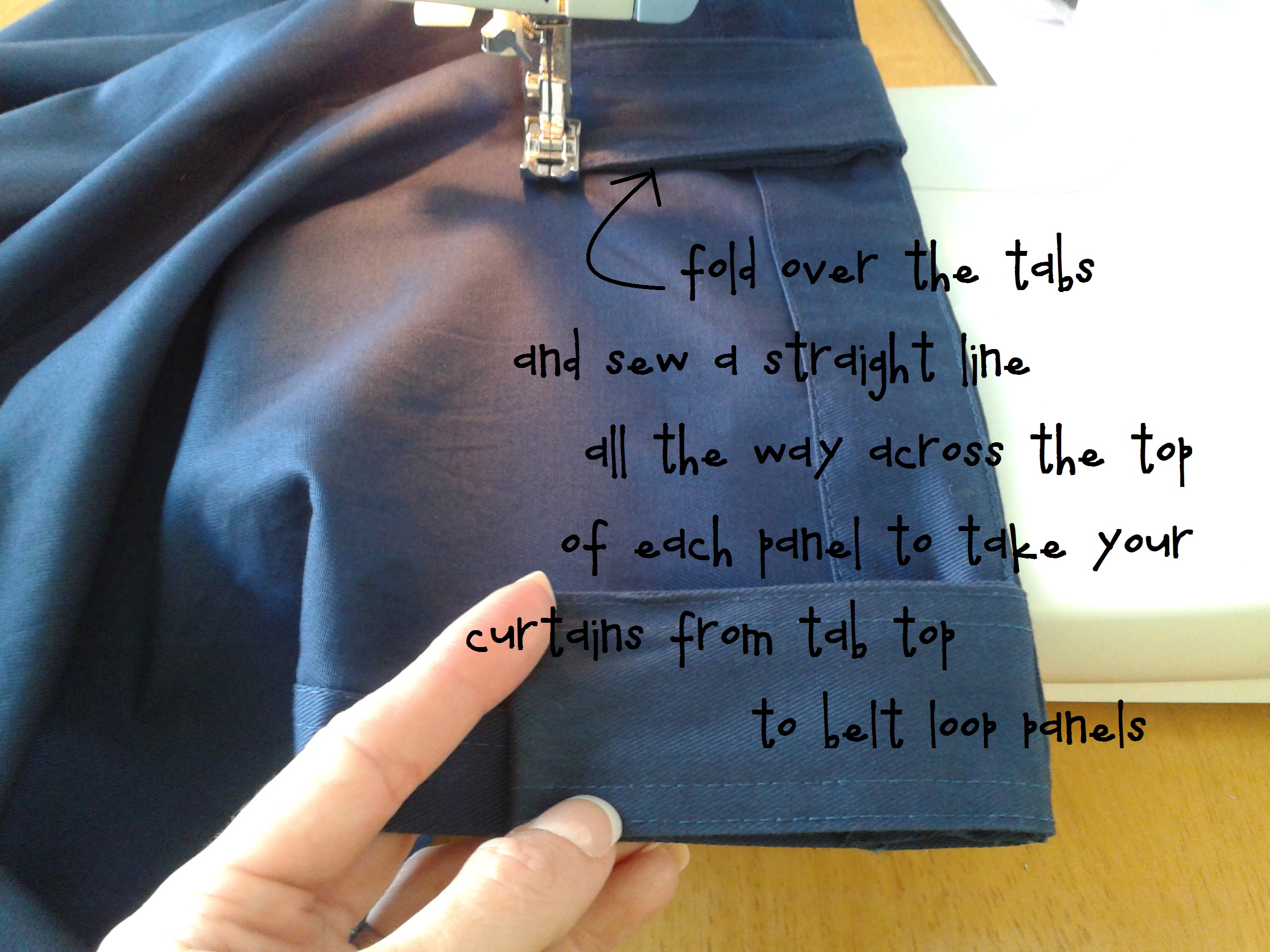 I not only wanted to lengthen the curtain panels, but I also wanted to change them from tab top to belt loop top. I don’t really like the way tab tops look, and belt loop tops pleat SO nicely and naturally when opened! All I did was foldover the tabs and sew straight across the top of the panel.