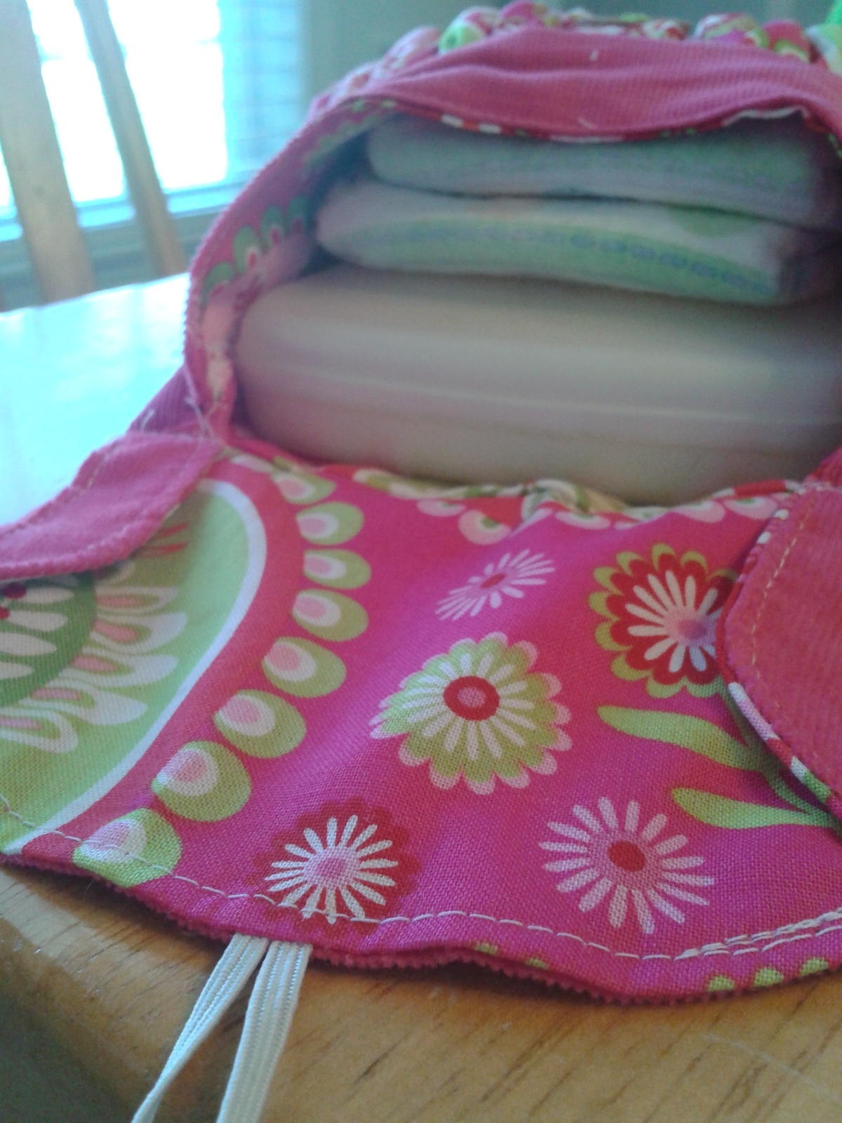 Besides a diaper bag for church and a diaper bag just to have in the car, I *also* keep a couple of diapers (or nappies, for our European readers) and wipes in my purse. Overkill, much? But while I have two very cute little totes as diaper bags, the purse diapers & wipes are tossed into the fray with nothing but a hair elastic to keep them bound together. A little sad. So yesterday I whipped up a little dipes & wipes pouch. Much better!