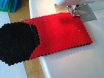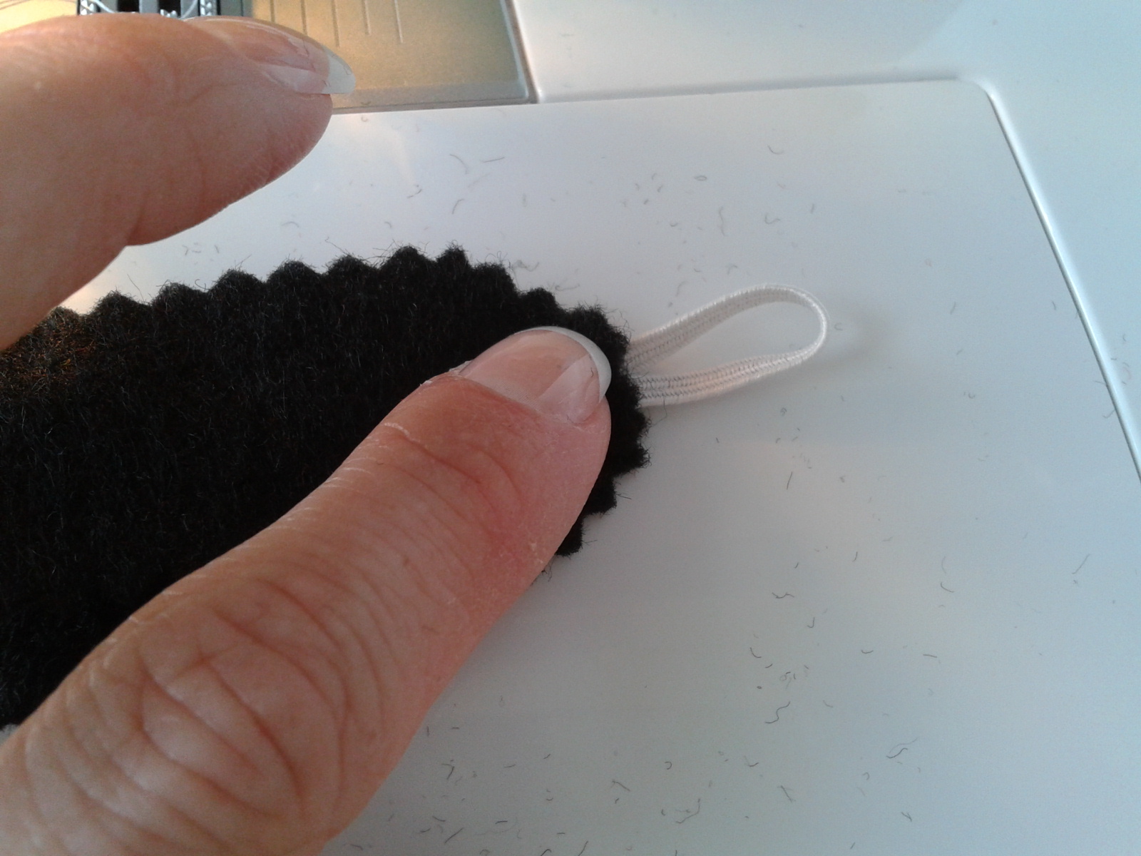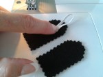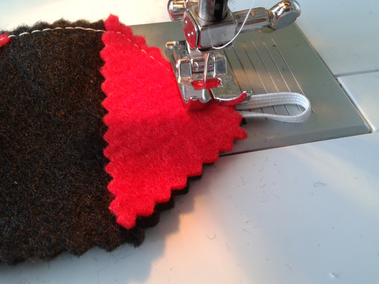 First, loop one of the pieces of elastic (below left) and sandwich in between your two belt loop pieces (below middle). Sew around the perimeter (below right).