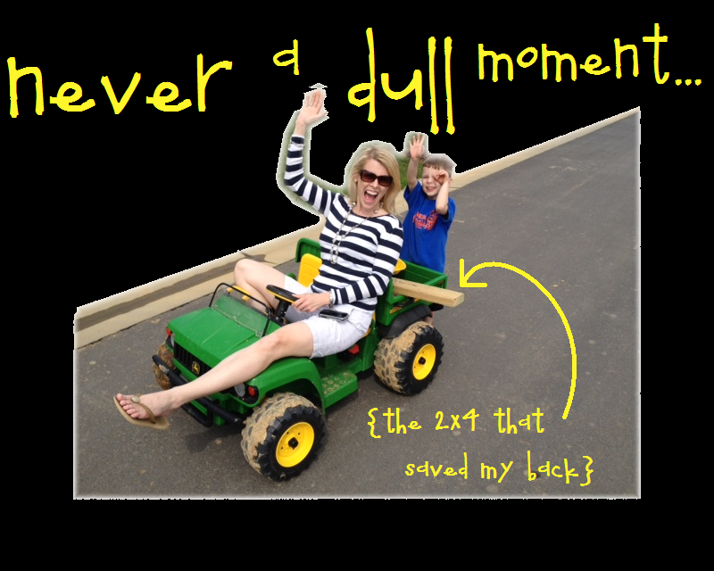 Well, he, the kids, and I were on a walk/stroll/gator/bike ride around the neighborhood when the gator battery went flat. It’s easy enough to push the gator with the gas pedal pressed, so we pressed on. But it’s not so easy on my back, bending over to push that thing. So when we passed by a construction dumpster, I plucked an obliging 2 x 4 off the top of the stack. It was a perfect handlebar as I pushed Li’l Bro in the gator; I just wedged one end in the back and pushed on the other end.