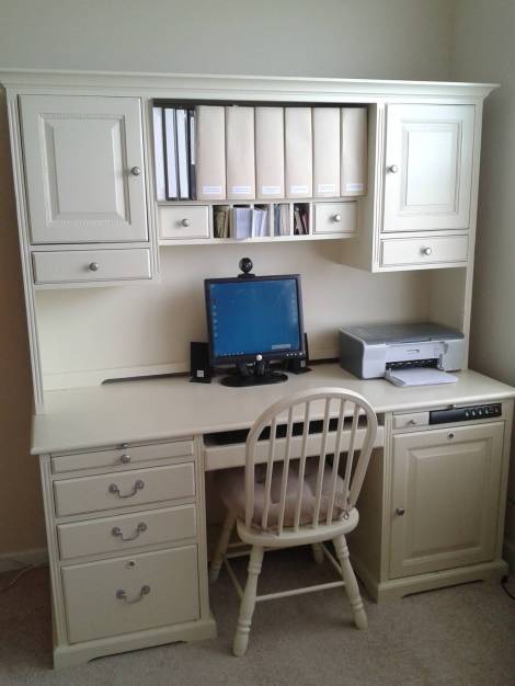 With the wonderful addition of our beautiful daughter a year and a half ago, our playroom/office became bedroom #4. The toys were easily thinned out and divided between the boys’ rooms, friends, and a donation/yard sale box, but our desk ended up in our bedroom. *groan* But it could be worse (MUCH worse) because we used to use a folding table as a desk, but a few years ago, we were given a fantastic desk which I sprayed creamy white. [I’ll be chatting about that score and several others in a later post entitled “Fifteen Pieces of Furniture for Under $200 {Total}” (or something pithy like that).]