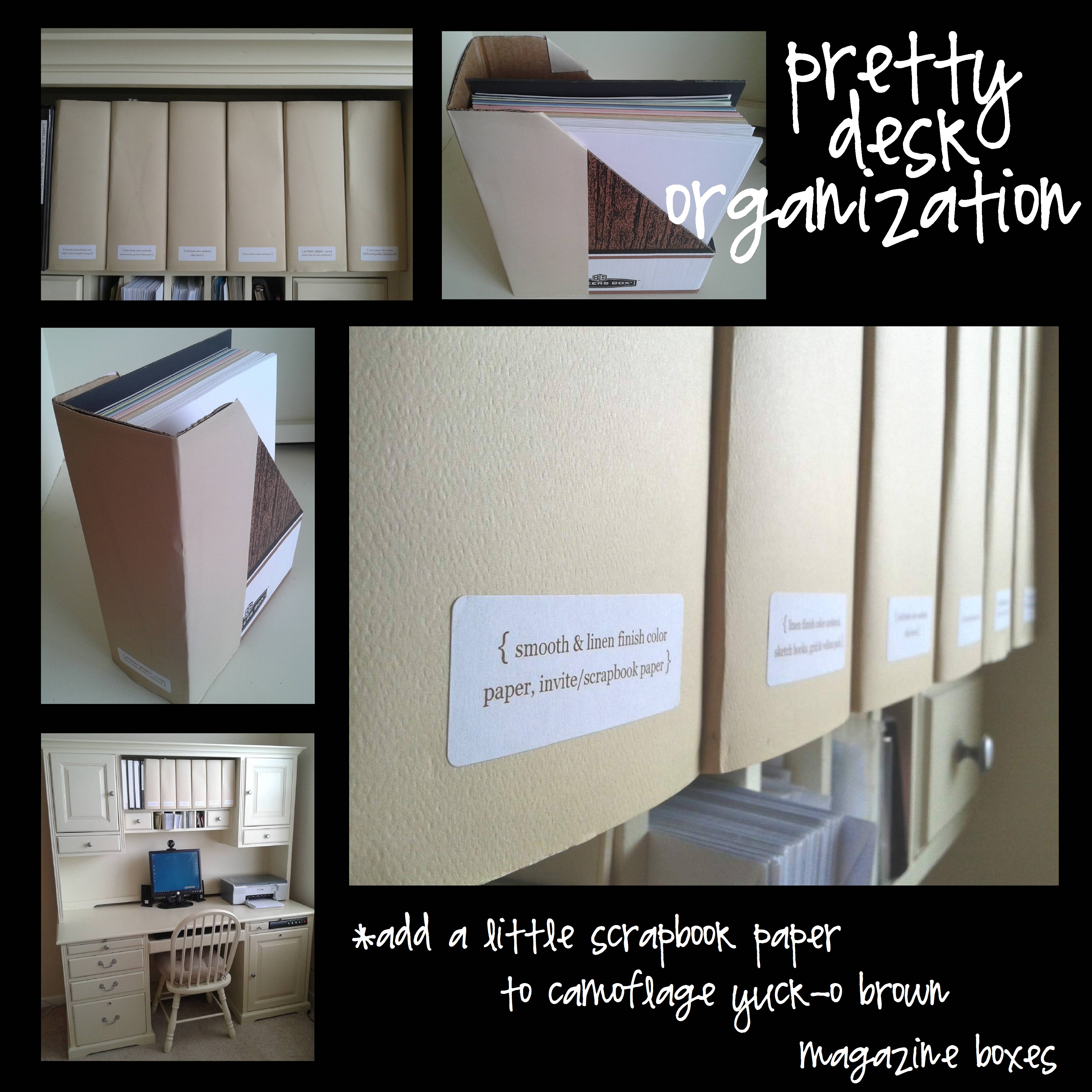 The other thing I have a lot of is paper: thick, thin, colored, textured, etc… [In my defense, I’ve been making custom invitations, announcements, and stationery for almost a decade, and I like to take my own paper to the printer, so at least I’ve got a reasonably good excuse… right?] I simply attach 12″ x 12″ scrapbook paper [half] “jackets” to the spines of some cheap cardboard magazine boxes from the office supply store. Just trim to fit height (if necessary), then glue the spine; then fold back paper and glue the sides. Easy-peasy. Of course, you could make these really pretty with an assortment of coordinating papers, but we wanted to keep the look very neutral… I didn’t exactly want the desk to become the design feature of the room. Add a few printed mailing labels to make everything easy to find and you’re done.