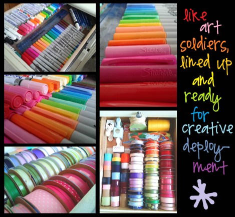 There is a drawer for my sharpies and paint pens… And another just the right depth for rolls of ribbon… Yes, I have a lot of markers and ribbons. Don’t hate. Are there items you have that can be organized and easily accessed with just a little rearranging? I kinda get inspired whenever I open these top two drawers… The bottom LEFT ribbon in the bottom RIGHT photo below (is that confusing enough?) is stored on three paper towel rolls. They take up much less space than the full original rolls of ribbon and help me keep loose pieces accessible and organized.
