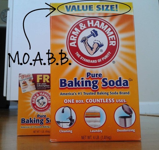 Okay, now don’t wimp out on me with one of those mamby-pamby baking aisle sized boxes, either. Go for the MOABB: the Mother Of All Baking soda Boxes. The stores keep these bad boys in the laundry detergent aisle.