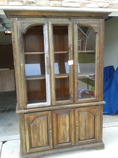 I started to settle at one point when I spotted a free one on CraigsList, but when my husband brought it home, it was in pretty rough shape… It wasn’t the style or size I was looking for… And it had been left outside for who knows how long… And my husband and friend had actually picked a lot of debris and pine needles out of it before loading it onto our friend’s truck… And it was sun damaged… And a little water damaged… And a pane of glass was missing… And one of the doors was broken and falling off…
