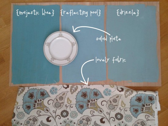 I painted three large swatches onto a thin of scrap plywood. I *love* to do this because not only is it cheap (like under $3 each), but doing the samples lets me see the color in a larger area in the right light (so the board is leaning up against my dining room wall now where the china cabinet is going). I’d love to know which blue you’d go with!