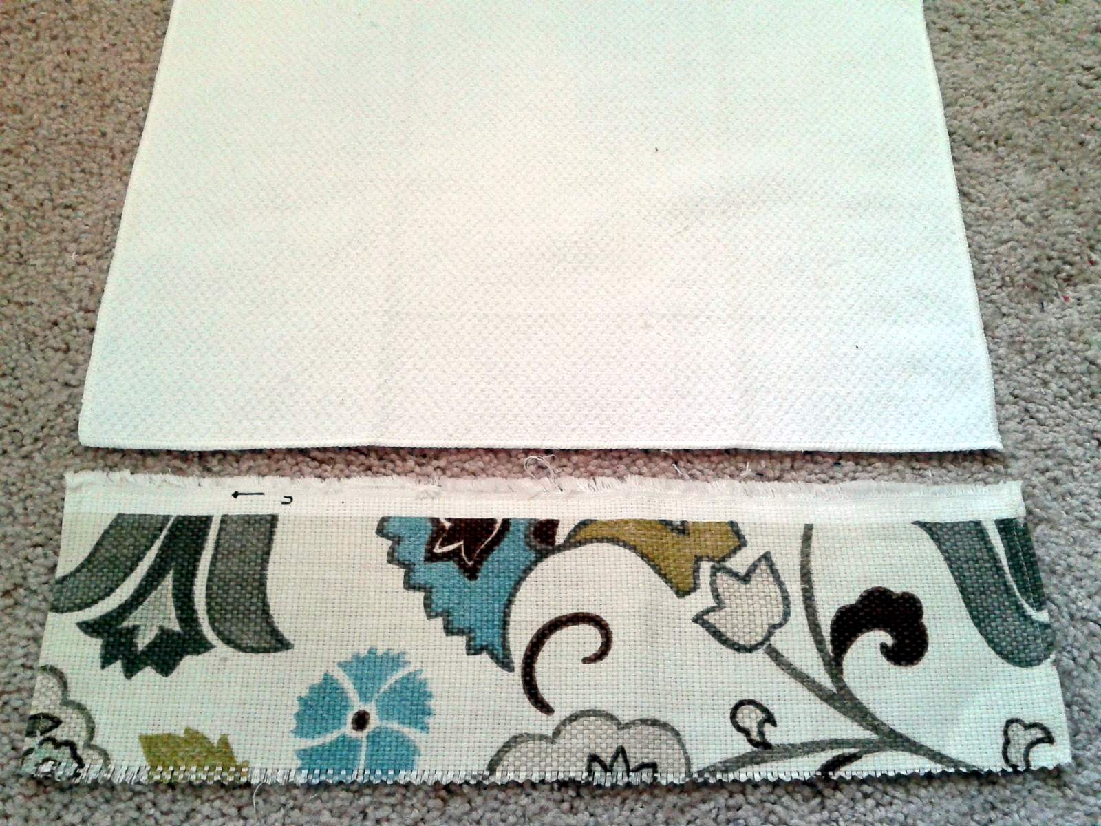 Take a piece of fabric about 5 inches long and as wide (plus seam allowance) as your towel. Fold over the left & right sides and sew a clean edge, making sure that your finished width is the same width as the towel (above).