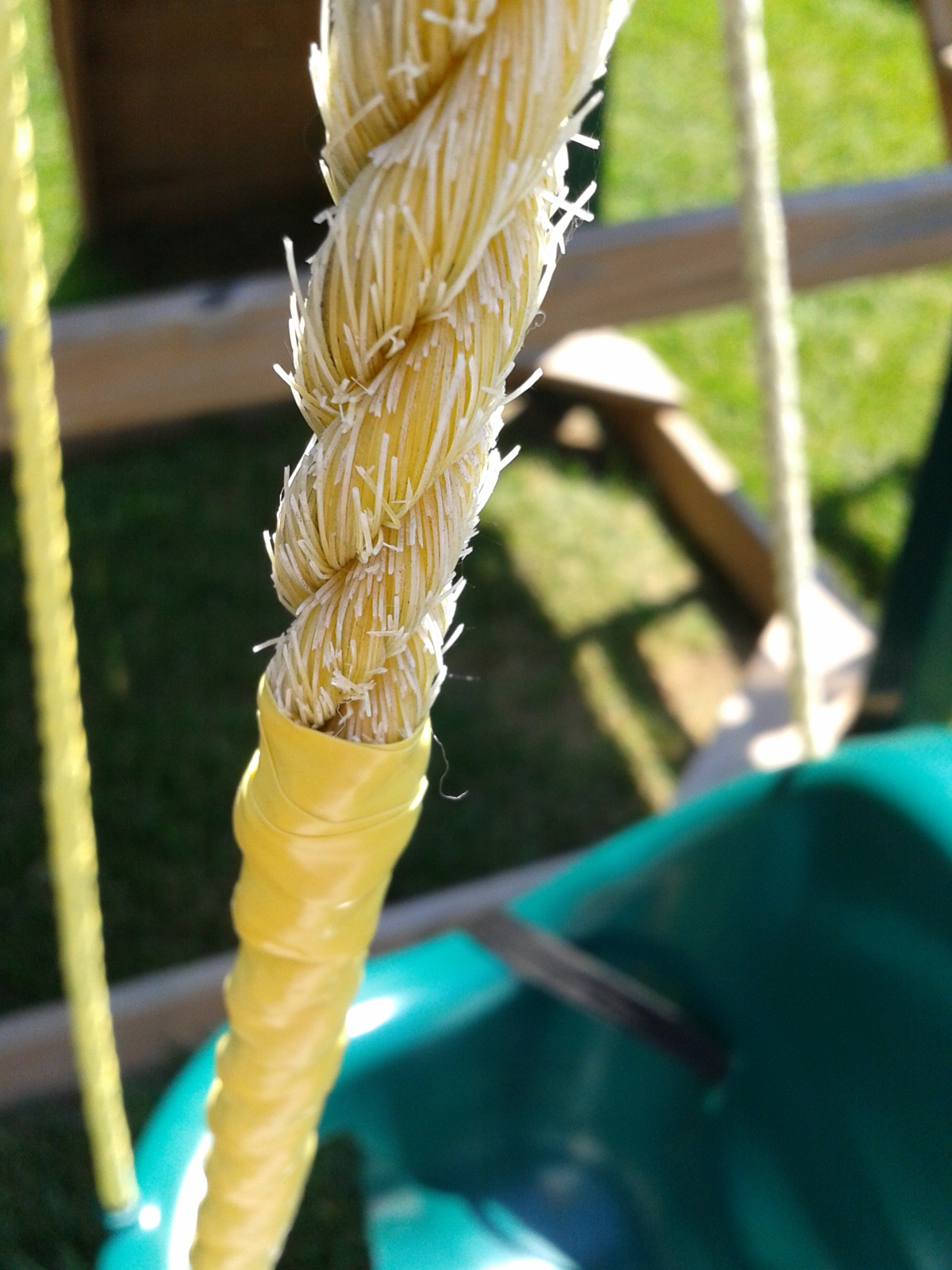 Unfortunately, Sissy’s swing is held up by rope that has become really prickly and spiky as it’s aged. It’s no fun to get in and out of or to hold on to. [What were you thinking, swing manufacturer??]