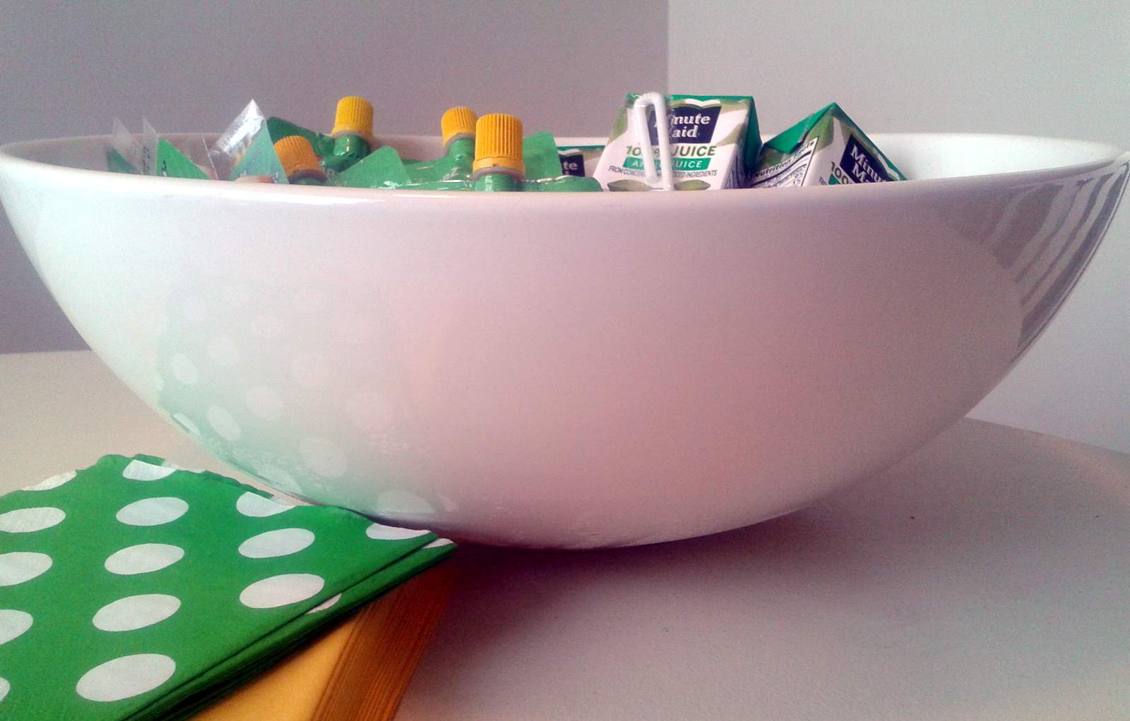 So I grab a big bowl with handles and toss in some ice, then I put in some apple sauce pouches, apple juice boxes, cheese sticks, and banana halves. I try to choose non-messy, simple to open & eat foods. It’s an open bowl, so grabbing a snack is easy for little hands. And it’s great because you don’t have to do any prep work (besides cutting the bananas in half), and none of the food will go to waste: What isn’t eaten can go straight back in the fridge, and the bananas can get a little piece of press & seal over the cut parts.