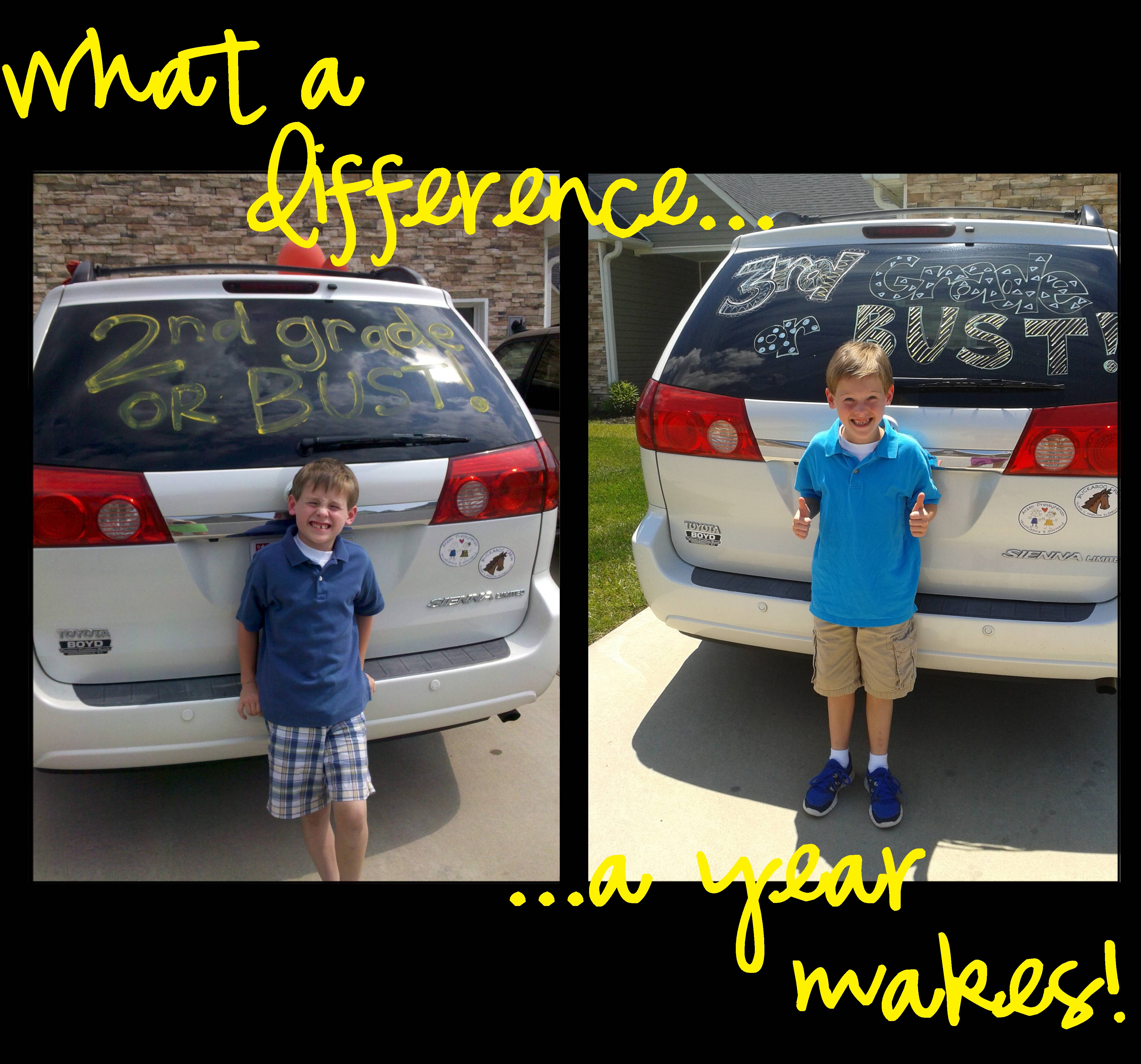 We have developed the tradition of decorating the car for the last day of school each year. This year, I used Chalk Ink wet wipe markers to decorate the swagger wagon (and LOVED the ease of use and results). I use these on our little chalkboard at home, but this morning when I realized I’d forgotten to get car window paint (YIKES!), it dawned on me that these might do the trick, and sure enough they are good on chalkboards, glass, plastic, and metal. Wahoo!