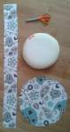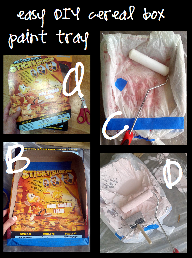And… RESOURCEFUL or JUST PLAIN CHEAP? 😉 I was just dipping the roller sideways into the can of paint because I didn’t have a paint tray, but then it dawned on me that it would be really easy to make one, so I just (A) cut the back off a cereal box (in retrospect, you could just cut it along both long and one of the short sides). Then (B) tape one short edge to one short end (or just fold it down if you didn’t cut one end), and tape the other end to the inside of the box to form a paint tray slope. Next (C) “double bag” it by putting it inside two plastic grocery shopping bags, and tape it off at the openings to secure (I used blue tape because it’s what I had on hand, but you could also use scotch tape or duct tape or whatever). And (D) Voila! Instant free disposable paint tray (more “zero clean up”! I love that!).