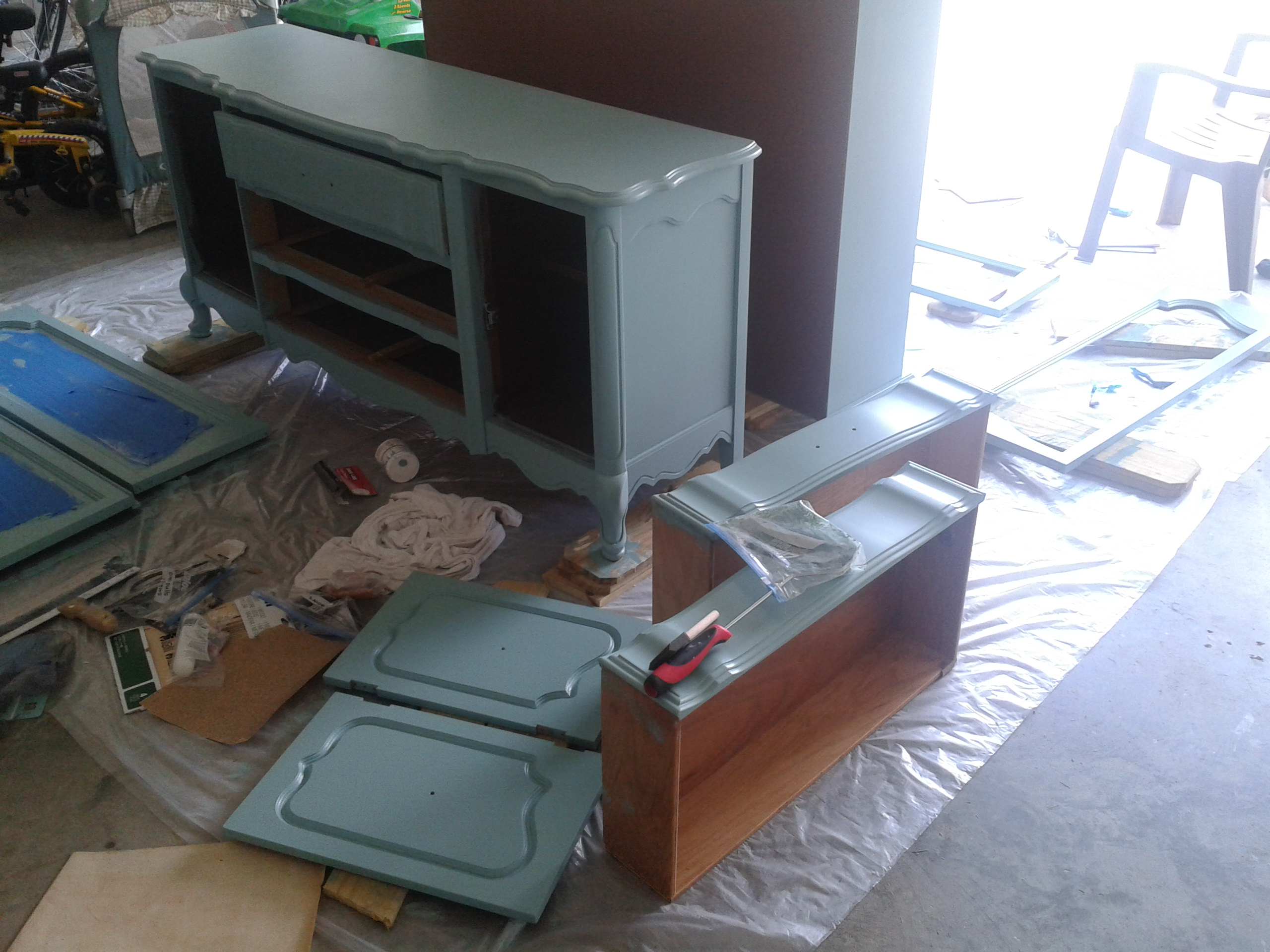 We set up in the garage with a cheap plastic drop cloth from Lowe’s Home Improvement. I propped up the buffet (bottom) and the hutch (top) of the china cabinet to be painted on a few pieces of fence picket scraps (so the drop cloth doesn’t stick). Make sure to position your furniture so that you can get to all sides and angles easily.