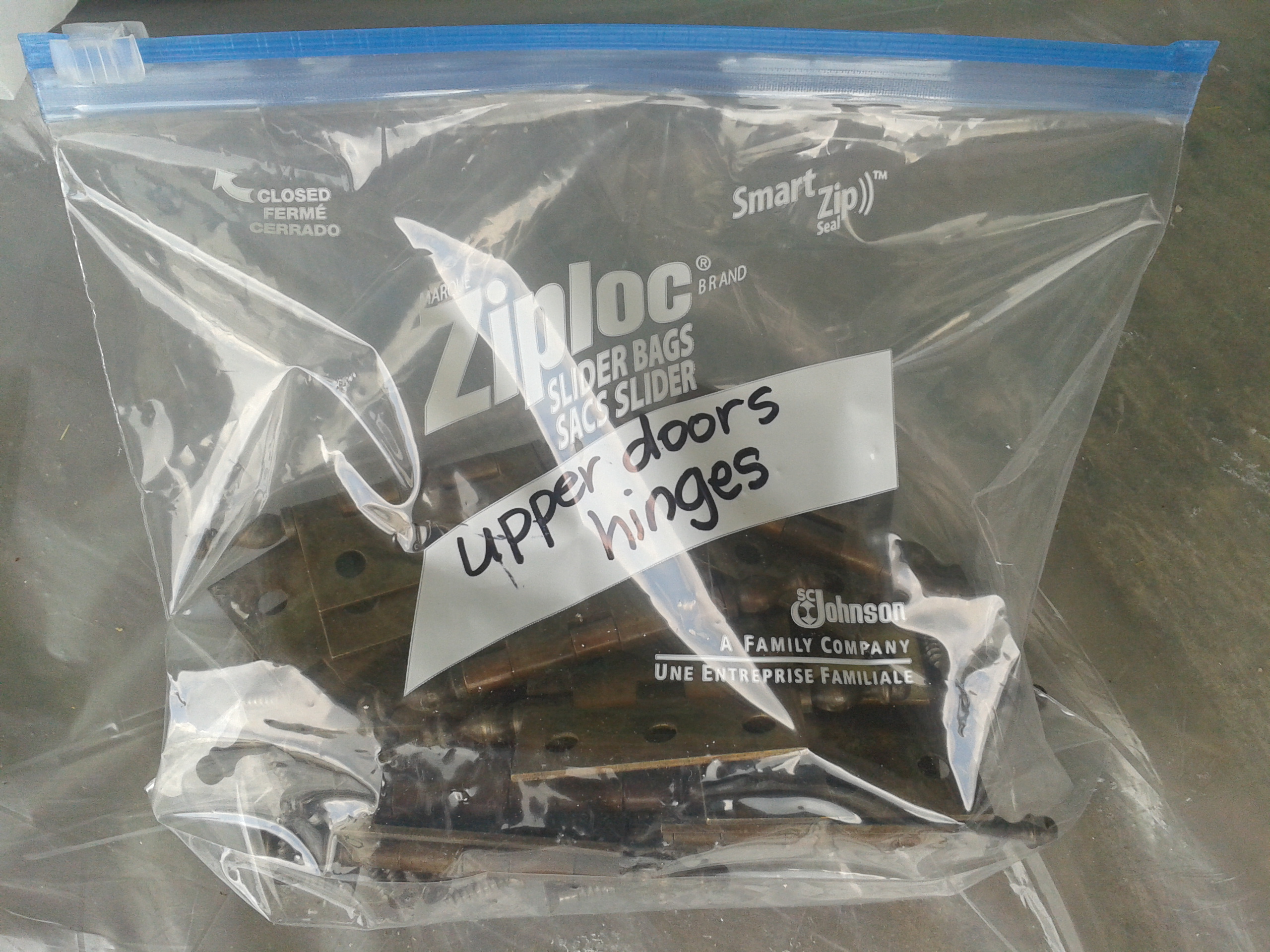 Remove all the hardware. I know it can seem a little tedious, but you do not want to be searching for missing screws once you’re done painting. So go ahead and put the removed hardware in bags. It’s also a great idea to put different handles and their corresponding screws in a different bag (so for example, drawer pulls in one bag, upper door hinges in another, upper door pulls in a third), and take two seconds to label them so you don’t have to figure out again where each pull and hinge goes.