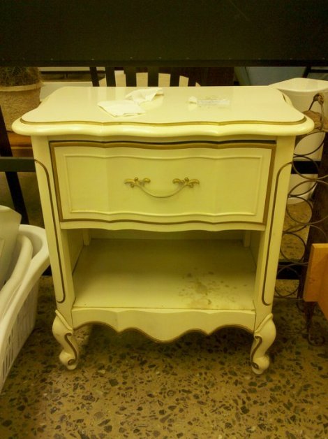 I needed to find this “before” photo that I’d snapped in Goodwill last year when I bought Sissy’s side table. I remembered it was close to Mother’s Day because my sweet MIL Janet had sent me $25 fun money with which I purchased this little gem! So I scrolled down to May of 2011 on my facebook timeline, and there it was!