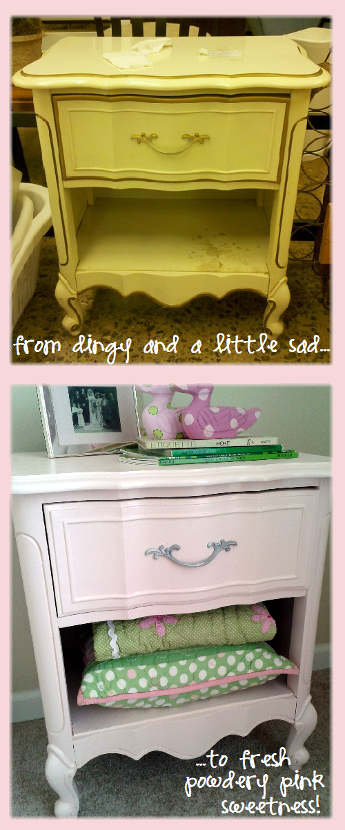 pink side table makeover before and after Published June 20, 2012 at 500 × 1200 in Before & After: Goodwill Bedside Table Goes Powder Pink ← Previous Next →