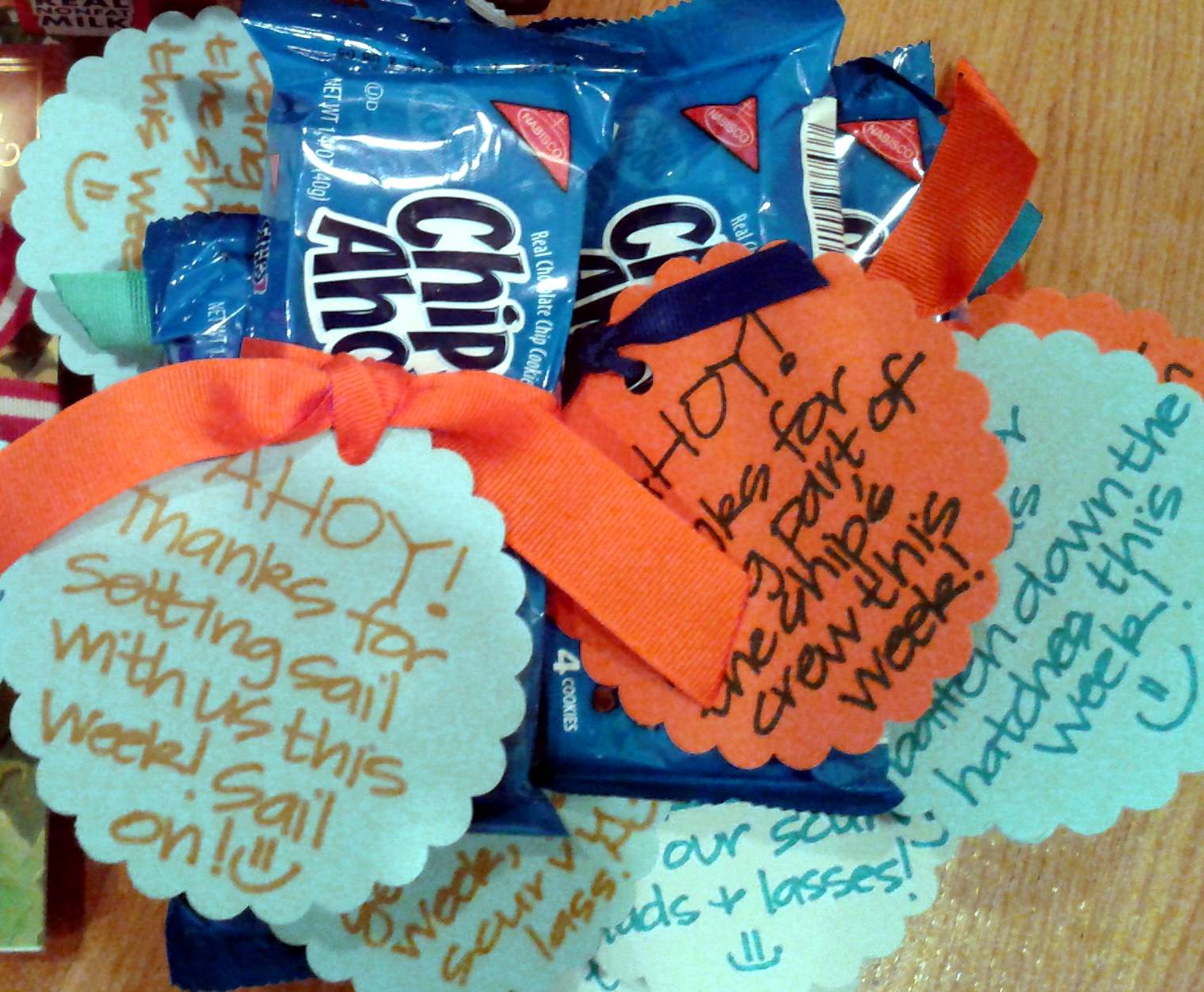 The theme for the week was “Sail On!” and our verse was “Let your light shine” from Matthew 5:16 (kind of like a lighthouse)… so there were lots of pirates and beachy and sailor inspiration. I strolled down the candy & cookie aisles at the grocery store looking for words in the products that would suit my theme. Lo and behold (land ho!), I saw the Chips Ahoy and thought they’d fit the bill perfectly. So I grabbed a twelve-pack of the snack size packets and headed on my way.