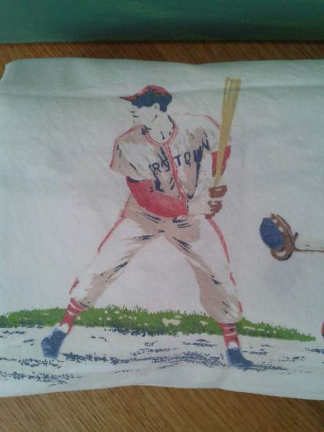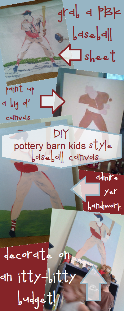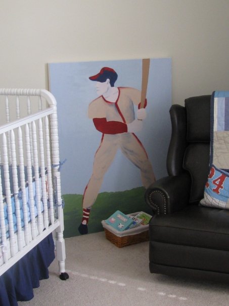 But for Li’l Bro, I drew inspiration from his sheet set. It is Pottery Barn Kids Home Run sheeting from a few years ago. It’s covered in baseball playing scenes. The feel is graphic and vintage. Perfect for this canvas! And if you feel you might lack the artistic hutzpah to tackle this freehand, see about getting your hands on an overhead projector (if you are actively involved serving at your child’s elementary school, they may let you use one of theirs??).