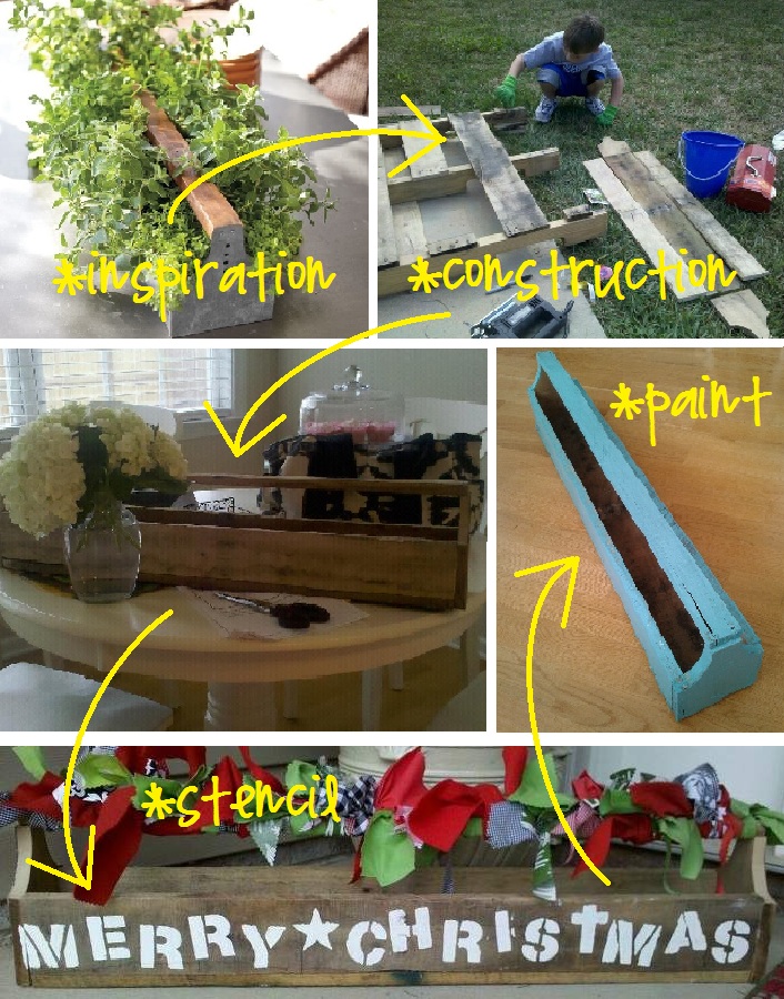 So when I saw this loverly little herb trough in a Pottery Barn catalog (for a small fortune), I decided to make my own one out of pallet wood (for free! wheee!). Then it got a stencil mini makeover for Christmas. Most recently, it went turquoise, and it’s been on our dining room table for a couple of months like that.