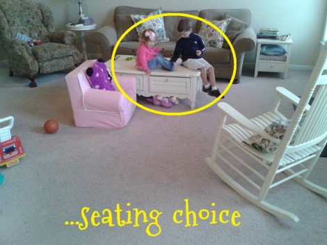 So that’s a chair (you can’t see off to the left there), another chair, the sofa, another spot on the sofa, a third spot on the sofa, a rocker, a fire engine, and a pink chair…