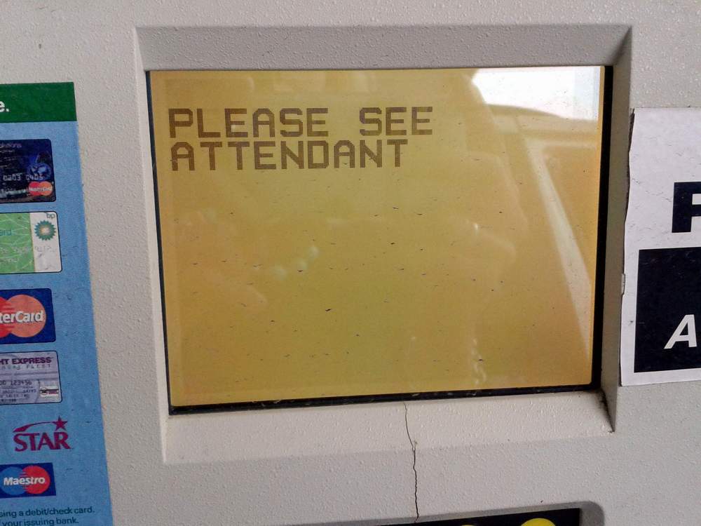 My showtune attitude washed away, I annoyedly pulled up to the next pump. Same message.