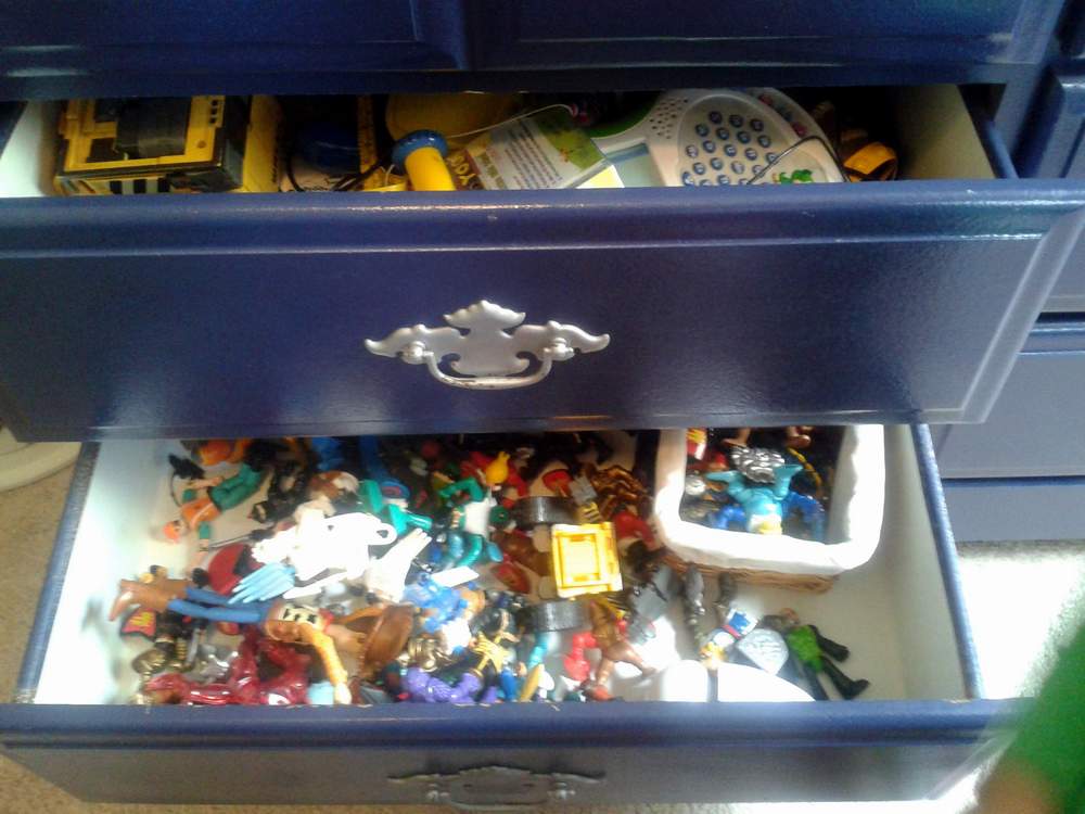 So one drawer holds miscellaneous small toys (he has a “big miscellaneous toys” tub in his closet); a second hold action figures.