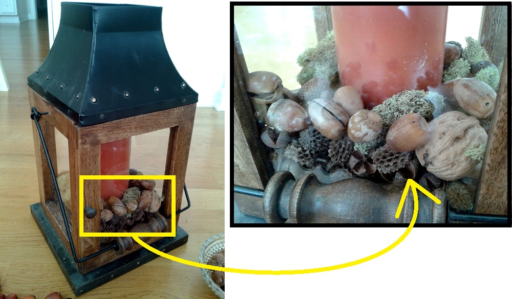 Working with what I had on hand, I put a pumpkin spice pillar candle in each lantern, then started adding my natural fall filler and the acorns the boys had collected (picking out the plastic acorns as I went and setting them aside). As I continued to scoop and fill, our five-year-old walked over and said something like, “there are worms moving in there!”